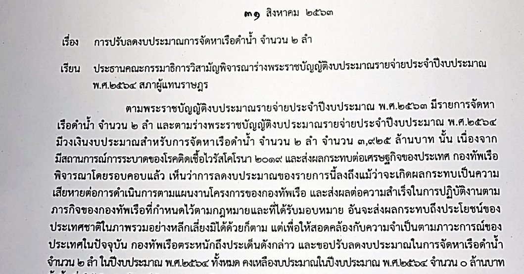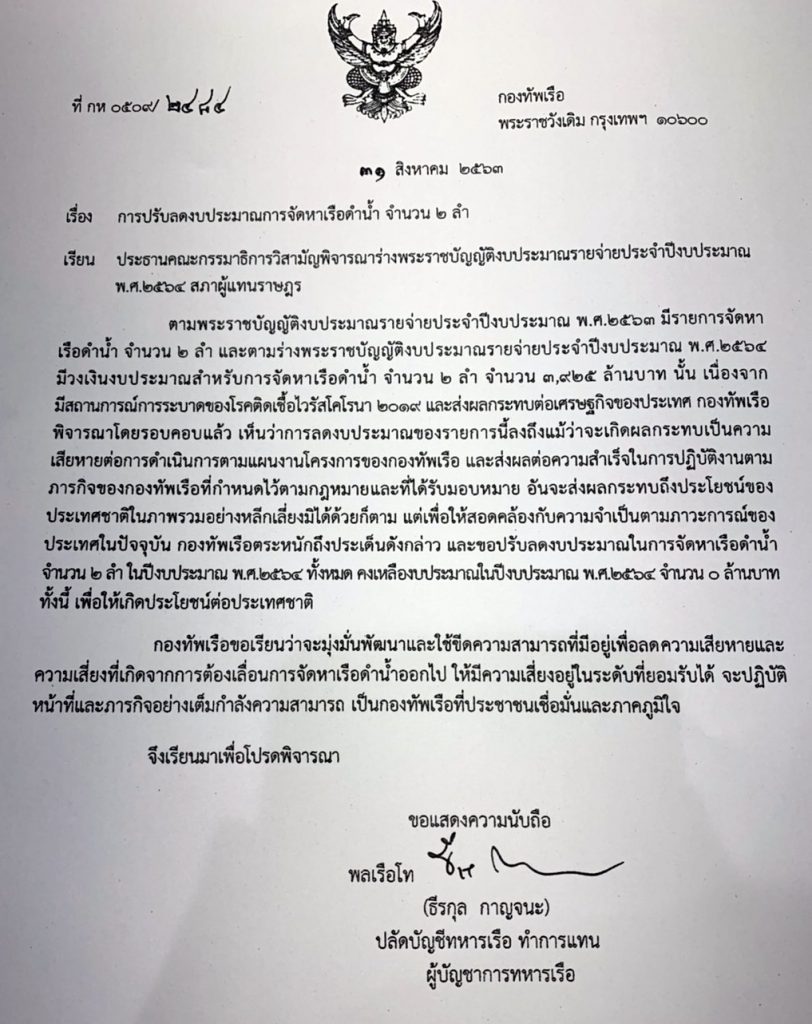 สำหรับหนังสือที่กองทัพเรือส่งถึงประธานคณะกรรมาธิการวิสามัญพิจารณาร่างพระราชบัญญัติงบประมาณรายจ่ายประจำปีงบประมาณ 2564 ลงนามโดยพล.ร.ท.ธีรกุล กาญจนะ ปลัดบัญชีทหารเรือ ทำการแทนผู้บัญชาการทหารเรือ เรื่องการปรับลดงบประมาณการจัดหาเรือดำน้ำจำนวน 2 ลำ ในงวดปีงบประมาณ 2564 วงเงิน 3,925 ล้านบาท เนื่องจากคํานึงถึงเศรษฐกิจของประเทศที่ได้รับผลกระทบ จากสถานการณ์การแพร่ระบาดของเชื้อไวรัสโควิด -19