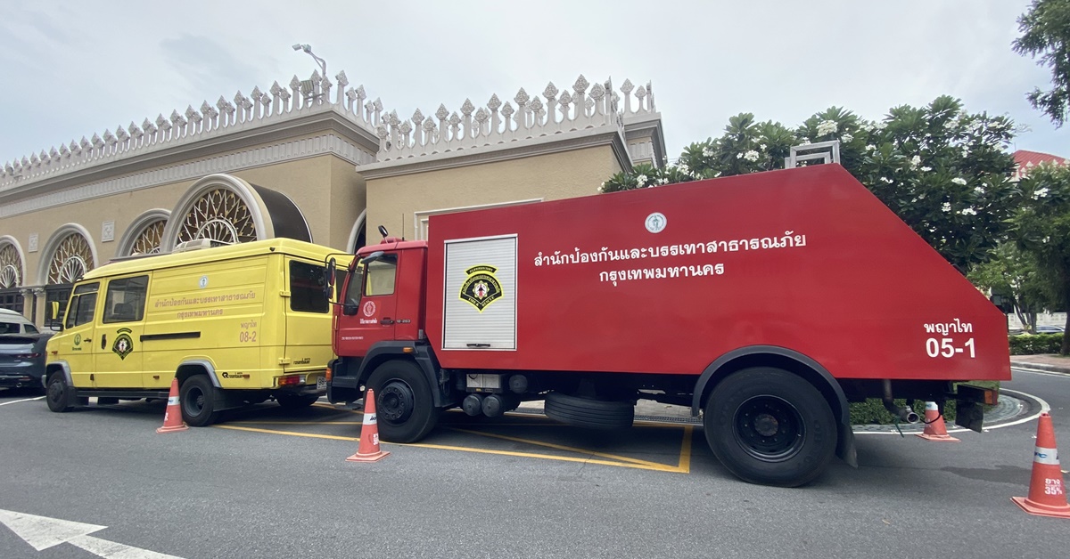 ทำเนียบฯ 18 ก.ย.-เจ้าหน้าที่นำรถดับเพลิงจากสำนักป้องกันและบรรเทาสาธารณภัย กรุงเทพมหานคร เข้าจอดในทำเนียบรัฐบาล เตรียมรับการชุมนุมพรุ่งนี้ (19 ก.ย.)