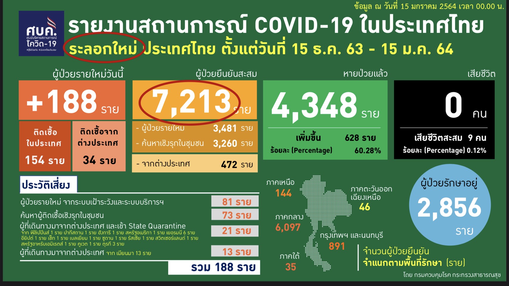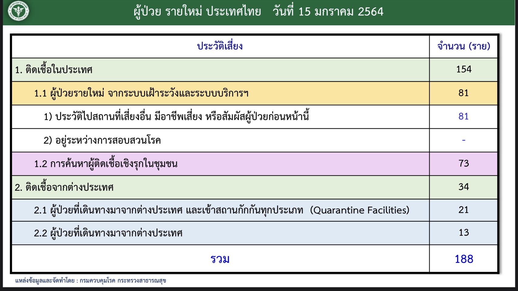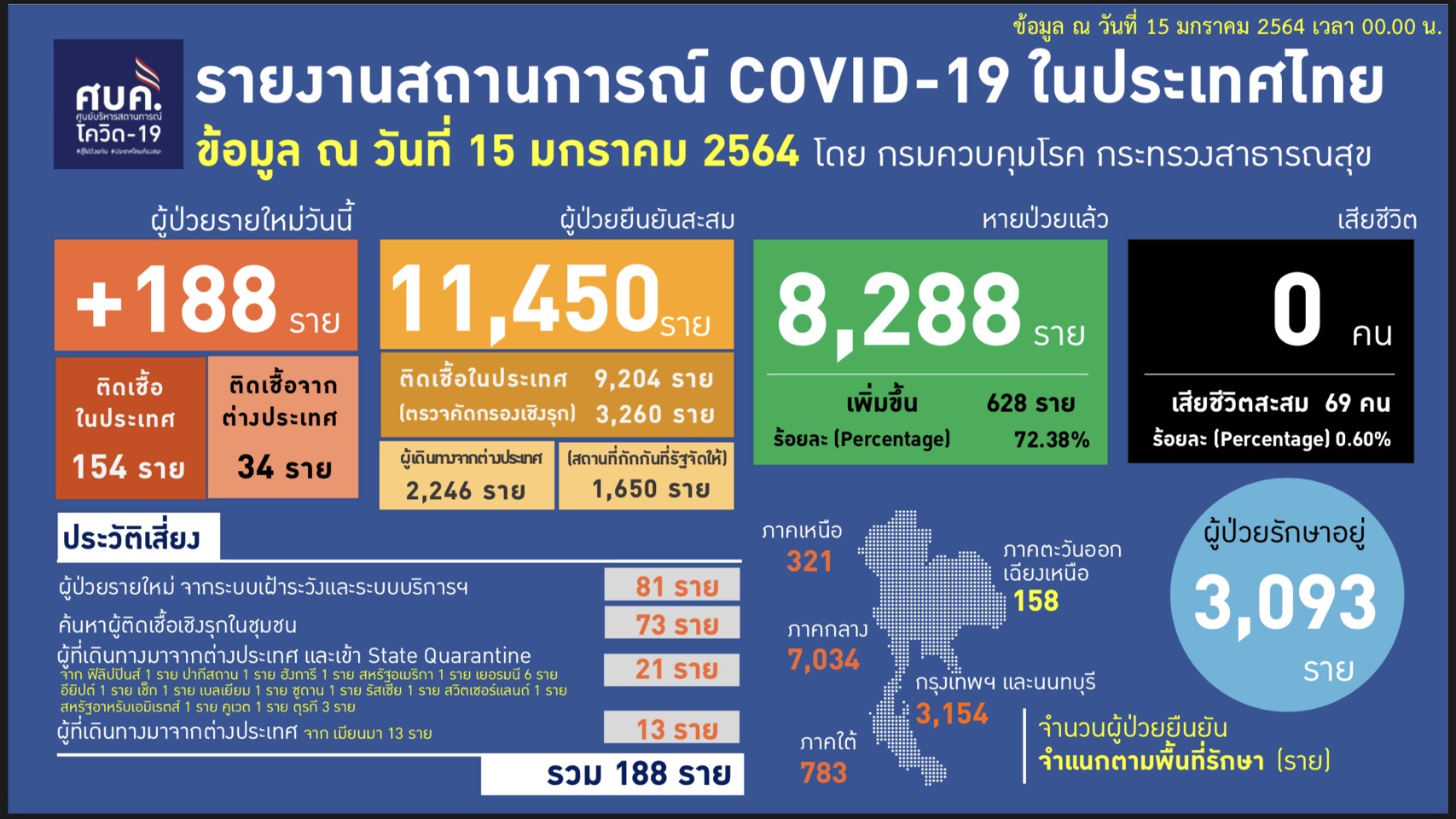 ทำเนียบรัฐบาล 15 ม.ค.- ศบค.เผยผู้ติดเชื้อโควิด-19 รายใหม่ 188 ราย ติดในประเทศ 154 ส่วนสถานการณ์ทั่วโลกพุ่ง 93 ล้านราย ชมชาว กทม.ช่วยกันป้องกันโรคดี คงตัวเลขสองหลักไว้ได้ ทั้งที่ปัจจัยเสี่ยงเยอะ