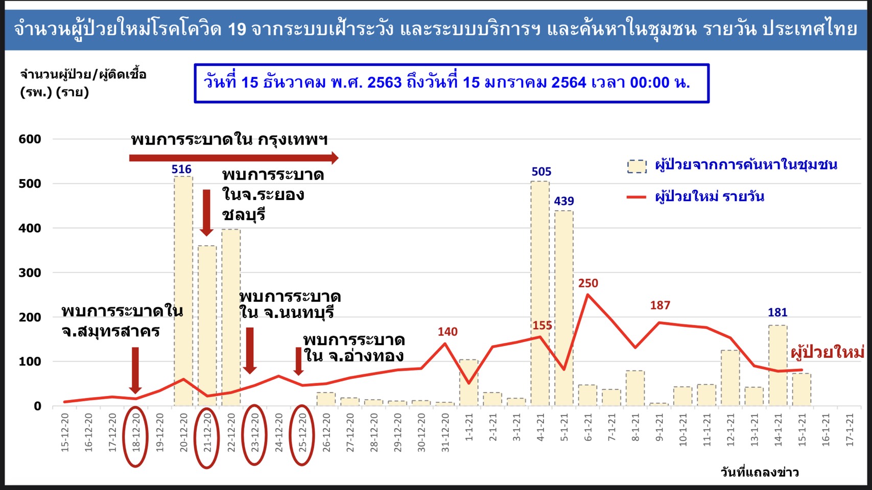 “รายละเอียดผู้ป่วยยืนยันสะสมระลอกใหม่ในประเทศไทย ตั้งแต่วันที่ 15 ธ.ค.2563 – 15 ม.ค. 2564 อยู่ที่ 7,213 ราย ติดเชื้อภายในประเทศ 3,481 ราย ค้นหาคัดกรองเชิงรุกในชุมชน 3,260 ราย ผู้เดินทางจากต่างประเทศ 438 ราย ผู้ป่วยรักษาหาย 628 ราย สะสมหายป่วยแล้ว 4,348 ราย กำลังรักษาอยู่ในโรงพยาบาล 2,856 ราย ยอดผู้เสียชีวิตสะสมอยู่ที่ 9 ราย” นพ.ทวีศิลป์ กล่าว