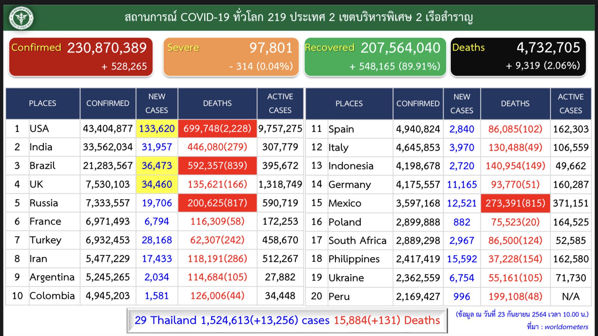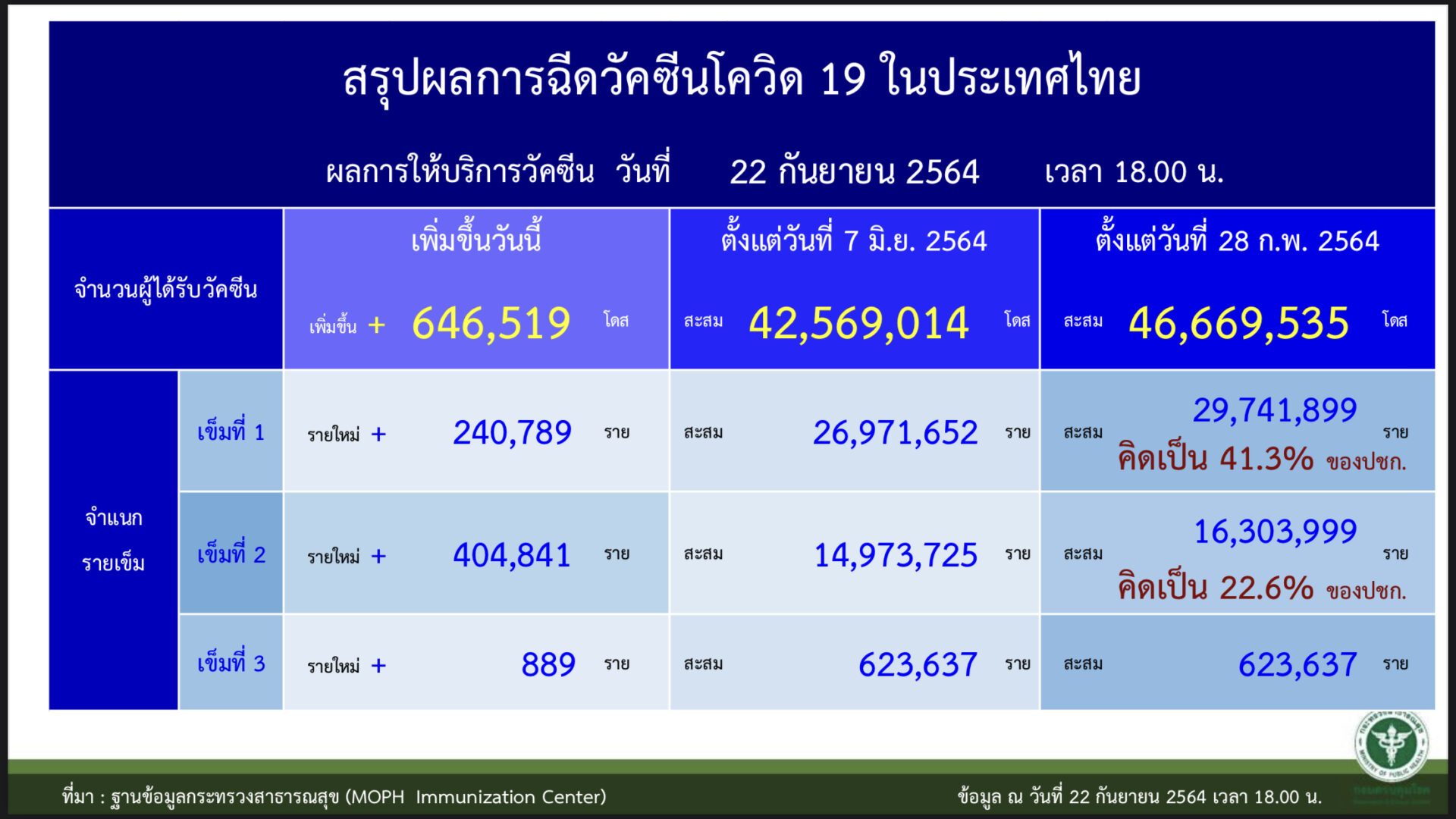 ทำเนียบรัฐบาล 23 ก.ย.-ศบค.พบผู้ติดเชื้อโควิดรายใหม่ 13,256 ราย เด็กอายุน้อยสุด 2 เดือนเสียชีวิต มีโรคหัวใจแต่กำเนิด ขณะที่คนไทยฉีดวัคซีนเข็มแรกแล้ว 41.3% ครบสองเข็ม 22.6%