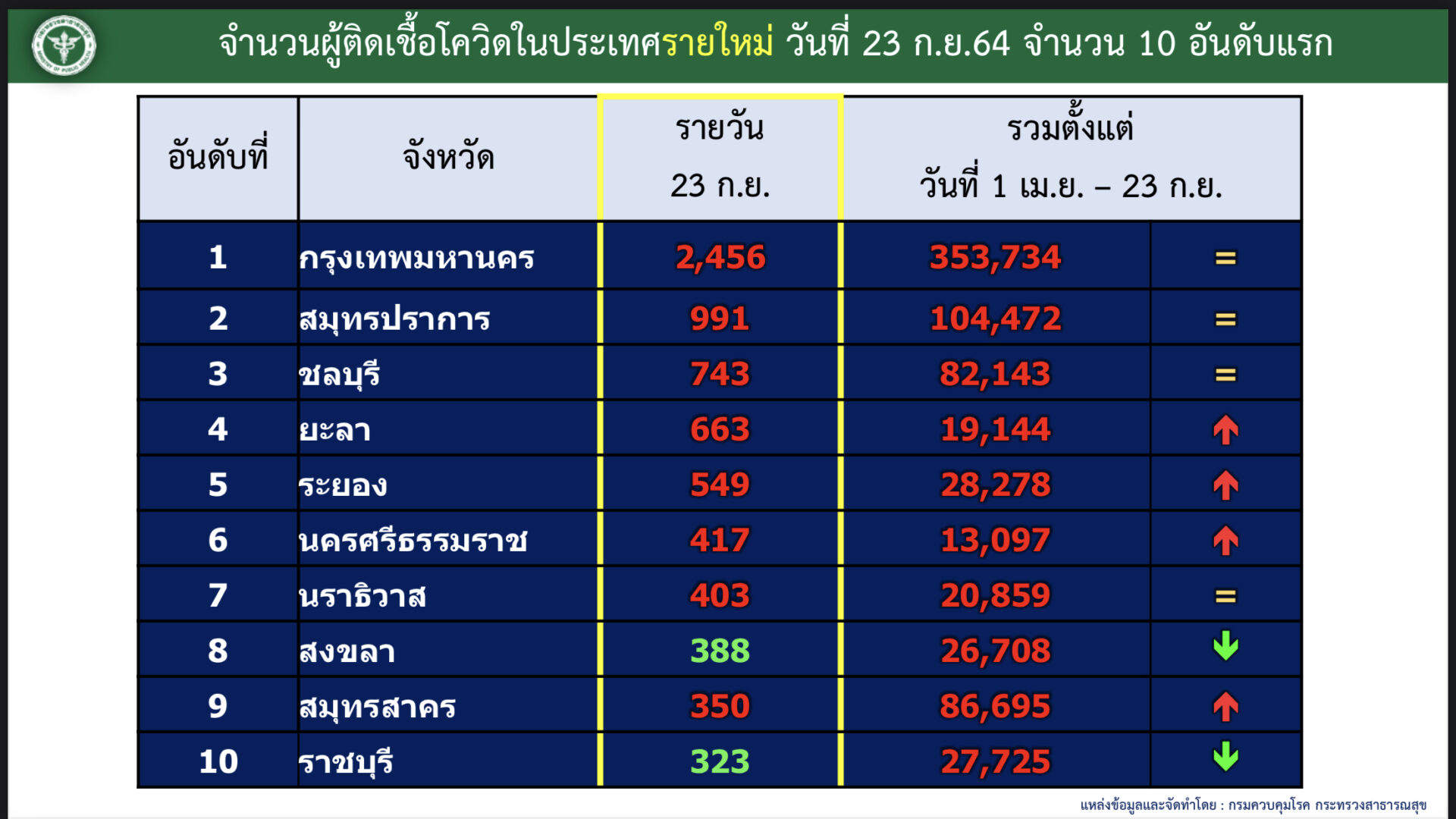สำหรับจำนวนผู้ติดเชื้อโควิดในประเทศรายใหม่ 10 อันดับแรก กรุงเทพมหานคร 2,456 ราย สมุทรปราการ 991 ราย ชลบุรี 743 ราย ยะลา 663 ราย ระยอง 549 ราย นครศรีธรรมราช 417 ราย นราธิวาส 403 ราย สงขลา 388 ราย