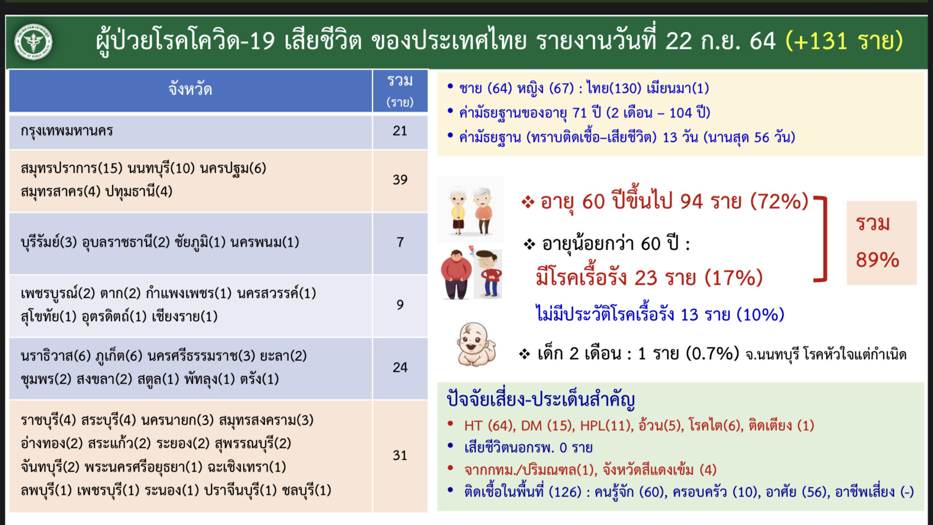 ส่วนผู้เสียชีวิต 131 ราย บ่งเป็นชาย 64 ราย หญิง 67 ราย เป็นชาวไทย 130 ราย เมียนมา 1 ราย อายุค่ากลาง 71 ปี อายุน้อยสุด 2 เดือน อายุมากสุด 104 ปี แบ่งเป็น กทม. 21 ราย สมุทรปราการ 15 ราย นนทบุรี 10 ราย นครปฐม นราธิวาส ภูเก็ต จังหวัดละ 6 ราย สมุทรสาคร ปทุมธานี ราชบุรี สระบุรี จังหวัดละ 4 ราย บุรีรัมย์ นครศรีธรรมราช นครนายก สมุทรสงคราม 3 ราย อุบลราชธานี เพชรบูรณ์ ตาก ยะลา ชุมพร สงขลา อ่างทอง สระแก้ว ระยอง สุพรรณบุรี จันทบุรี จังหวัดละ 2 ราย นนทบุรี ชัยภูมิ นครพนม กำแพงเพชร นครสวรรค์ สุโขทัย อุตรดิตถ์ เชียงราย สตูล พัทลุง ตรัง พระนครศรีอยุธยา ฉะเชิงเทรา ลพบุรี เพชรบุรี ระนอง ปราจีนบุรี ชลบุรี จังหวัดละ 1 ราย