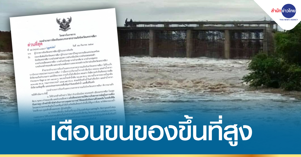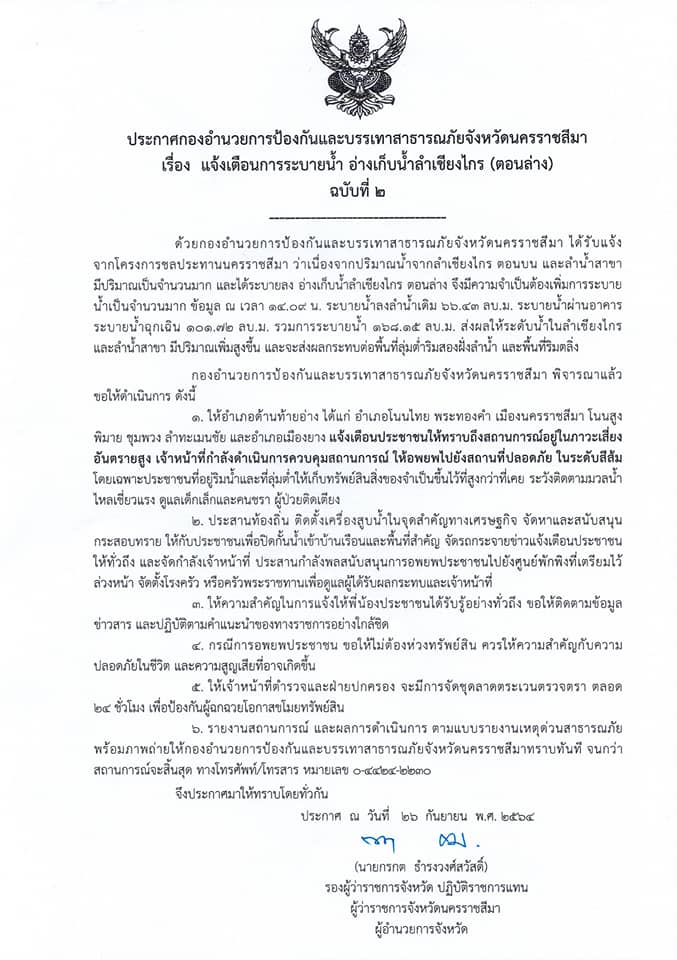 กรุงเทพฯ 26 ก.ย. – กองทัพภาคที่ 2 ประกาศด่วนเมื่อเวลา 19.36 น. วันนี้ (26 ก.ย.64) ขอให้ชาวโคราช พระทองคำ ด่านขุนทด โนนไทย โนนสูง พิมาย ขนของหนีขึ้นที่สูง กรณีการอพยพ ขอให้ไม่ต้องห่วงทรัพย์สิน ควรห่วงชีวิตและความสูญเสียที่อาจเกิดขึ้น โดยประกาศ ปภ.นครราชสีมา แจ้งเตือนการระบายน้ำอ่างเก็บน้ำลำเชียงไกร (ตอนล่าง) สถานการณ์อยู่ในภาวะเสี่ยงอันตรายสูง. – สำนักข่าวไทย