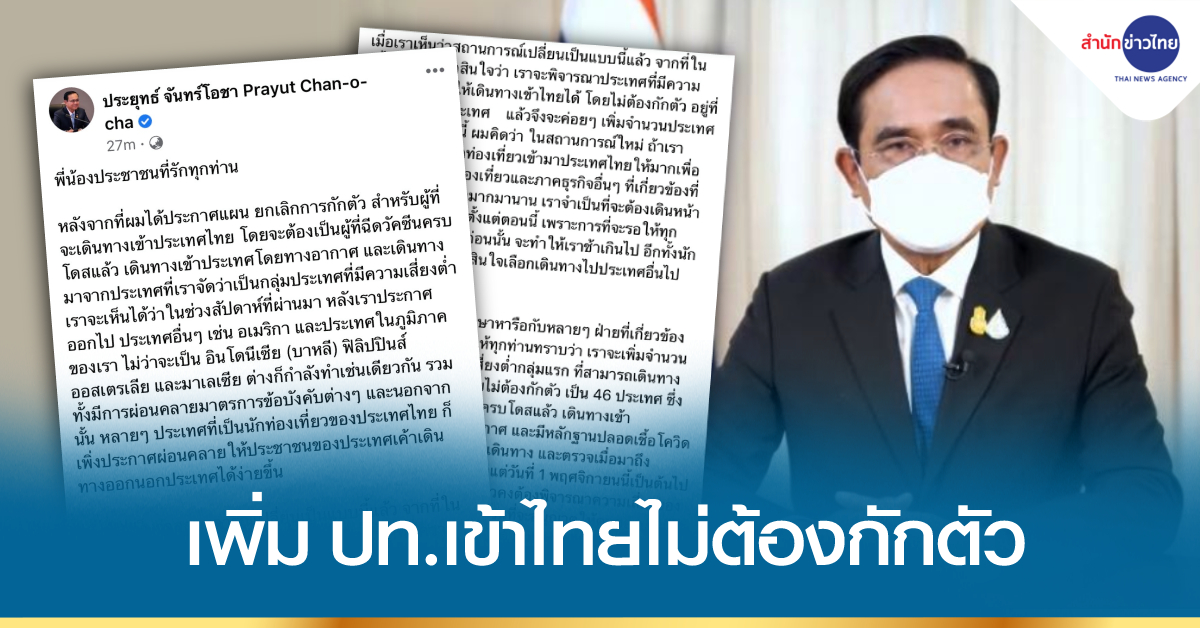 พล.อ.ประยุทธ์ จันทร์โอชา นายกรัฐมนตรีและรัฐมนตรีว่าการกระทรวงกลาโหม โพสต์เฟซบุ๊ก “ประยุทธ์ จันทร์โอชา Prayut-Chan-o-cha” ระบุว่า หลังจากที่ผมได้ประกาศแผน ยกเลิกการกักตัว สำหรับผู้ที่จะเดินทางเข้าประเทศไทย โดยจะต้องเป็นผู้ที่ฉีดวัคซีนครบโดสแล้ว เดินทางเข้าประเทศโดยทางอากาศ และเดินทางมาจากประเทศที่เราจัดว่าเป็นกลุ่มประเทศที่มีความเสี่ยงต่ำ เราจะเห็นได้ว่าในช่วงสัปดาห์ที่ผ่านมา หลังเราประกาศออกไป ประเทศอื่นๆ เช่น อเมริกา และประเทศในภูมิภาคของเรา ไม่ว่าจะเป็น อินโดนีเซีย (บาหลี) ฟิลิปปินส์ ออสเตรเลีย และมาเลเซีย ต่างก็กำลังทำเช่นเดียวกัน รวมทั้งมีการผ่อนคลายมาตรการข้อบังคับต่างๆ และนอกจากนั้น หลายๆ ประเทศที่เป็นนักท่องเที่ยวของประเทศไทย ก็เพิ่งประกาศผ่อนคลายให้ประชาชนของประเทศเค้าเดินทางออกนอกประเทศได้ง่ายขึ้น