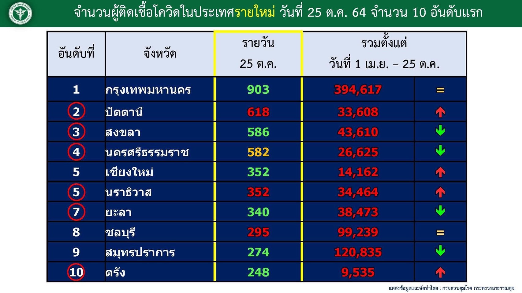 ผู้ช่วยโฆษกศบค. กล่าวว่า สำหรับ 10 อันดับจังหวัดที่ติดเชื้อมากที่สุด ได้แก่ กรุงเทพมหานคร 903 ราย รองลงมาเป็นจังหวัดปัตตานี 618 ราย สงขลา 586 รายนครศรีธรรมราช 582 ราย เชียงใหม่ 352 ราย นราธิวาส 352 ราย ยะลา 340 ราย ชลบุรี 295 ราย สมุทรปราการ 274 ราย และตรัง 248 ราย อย่างไรก็ตาม จำนวนผู้ติดเชื้อโควิด-19 โดยเฉพาะอัตราผู้เสียชีวิตลดลงอย่างต่อเนื่อง ซึ่งสอดคล้องกับสถานการณ์โลกเมื่อฉีดวัคซีนครอบคลุมมากขึ้น การติดเชื้อลดลง