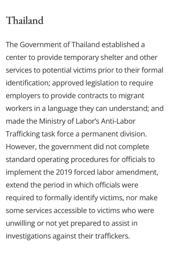 ในส่วนที่เกี่ยวข้องกับประเทศไทยนั้น มีประเด็นความก้าวหน้าที่ถูกหยิบยกขึ้น ซึ่งเป็นภาพบวก 3 เรื่อง ได้แก่ (1) การจัดตั้งศูนย์คัดแยกผู้เสียหายจากการค้ามนุษย์ เพื่อช่วยเหลือให้ที่พักพิงแก่ผู้ที่อาจเข้าข่ายเป็นผู้เสียหายจากการค้ามนุษย์ ในระหว่างการคัดกรองเบื้องต้นจนถึงการคัดแยกเพื่อระบุตัวผู้เสียหายอย่างเป็นทางการ (2) การออกกฎกระทรวงแรงงานให้ใช้สัญญาจ้างแรงงานต่างด้าว 3 สัญชาติ 4 ภาษา ได้แก่ ไทย เมียนมา กัมพูชา และลาว และ (3) การยกระดับฝ่ายศูนย์บัญชาการป้องกันการค้ามนุษย์ด้านแรงงาน ขึ้นเป็น สำนักงานเลขานุการศูนย์บัญชาการป้องกันการค้ามนุษย์ด้านแรงงาน ซึ่งเป็นหน่วยงานถาวรเทียบเท่ากอง ข้อท้าทายในรายงานฉบับนี้ มี 3 เรื่อง ได้แก่ (1) การทำขั้นตอนและแนวทางปฏิบัติที่ชัดเจนสำหรับการคัดกรอง คัดแยก และส่งต่อดำเนินคดี ในข้อหาการบังคับใช้แรงงานหรือบริการตามมาตรา 6/1 ซึ่งอยู่ระหว่างดำเนินการยังไม่แล้วเสร็จ (2) การขยายระยะเวลาในการคัดแยกผู้ที่อาจเข้าข่ายเป็นผู้เสียหายจากการค้ามนุษย์อย่างเป็นทางการ เพื่อให้เข้าถึงบริการของรัฐ มีเวลาเพียงพอที่จะรับการฟื้นฟูไตร่ตรอง และบอกเล่าความจริงในระหว่างการคัดกรองและคัดแยก (3) การจัดให้ความช่วยเหลือบริการของรัฐแก่ผู้เสียหายที่ไม่ประสงค์เข้าร่วมกระบวนการสืบสวนคดี