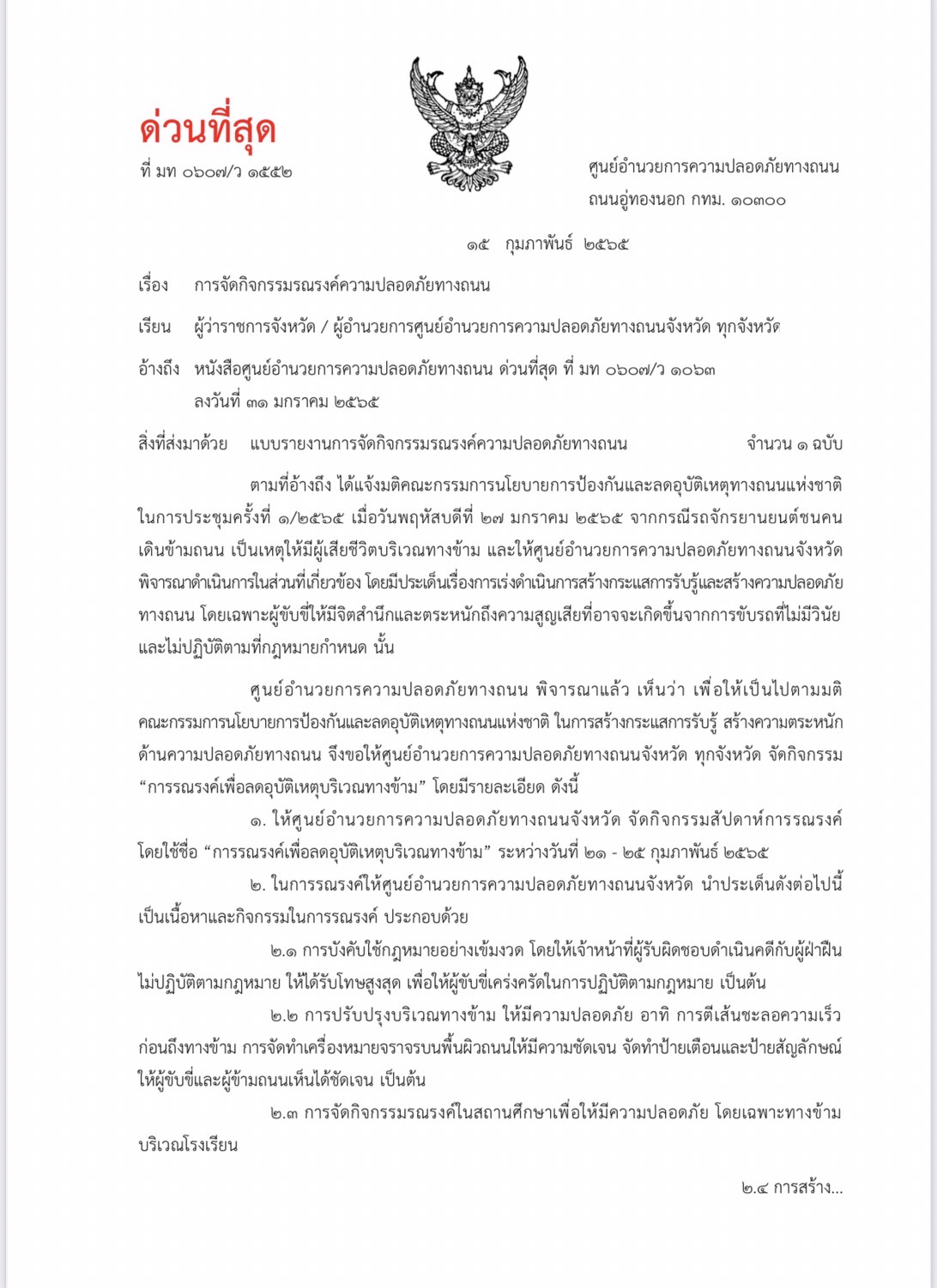 กรุงเทพฯ 16 ก.พ. – มท.1 แจ้ง ศปถ.ทุกจังหวัด Kick off รณรงค์ลดอุบัติเหตุบริเวณทางข้าม 21-25 ก.พ.65 พร้อมสร้างความปลอดภัยอย่างต่อเนื่องทุกเดือน รวมทั้งสร้างจิตสำนึกการใช้รถใช้ถนน และบังคับใช้กฎหมายอย่างเข้มงวด หากพบผู้ฝ่าฝืนต้องได้รับโทษสูงสุด