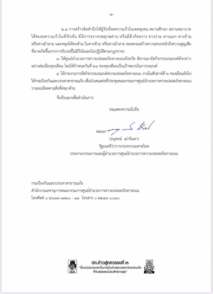 พล.อ.อนุพงษ์ กล่าวว่า เพื่อให้เกิดการสร้างกระแสการรับรู้ และสร้างความตระหนักด้านความปลอดภัยทางถนนให้เกิดขึ้นกับสังคมไทยอย่างมีส่วนร่วมจากทุกภาคส่วน โดยเฉพาะอย่างยิ่งประชาชนผู้ใช้รถใช้ถนน จึงได้สั่งการไปยังผู้ว่าราชการจังหวัดทุกจังหวัด ในฐานะผู้อำนวยการศูนย์อำนวยการความปลอดภัยทางถนนจังหวัด จัดกิจกรรมสัปดาห์การรณรงค์ ภายใต้ชื่อ “การรณรงค์เพื่อลดอุบัติเหตุบริเวณทางข้าม” ในระหว่างวันที่ 21-25 กุมภาพันธ์ 2565 ด้วยการบังคับใช้กฎหมายอย่างเข้มงวด โดยให้เจ้าหน้าที่ผู้รับผิดชอบดำเนินคดีกับผู้ฝ่าฝืนไม่ปฏิบัติตามกฎหมายให้ได้รับโทษสูงสุด เพื่อให้ผู้ขับขี่เคร่งครัดในการปฏิบัติตามกฎหมาย เป็นต้น และเร่งทำการปรับปรุงบริเวณทางข้ามให้มีความปลอดภัย อาทิ การตีเส้นชะลอความเร็วก่อนถึงทางข้าม การจัดทำเครื่องหมายจราจรบนพื้นผิวถนนให้มีความชัดเจน จัดทำป้ายเตือนและป้ายสัญลักษณ์ให้ผู้ขับขี่และผู้ข้ามถนนเห็นได้ชัดเจน
