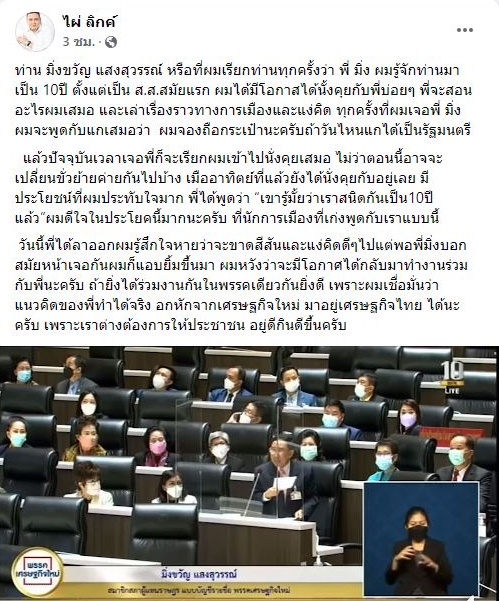 วันนี้พี่ได้ลาออก ผมรู้สึกใจหายว่าจะขาดสีสันและแง่คิดดีๆ ไป แต่พอพี่มิ่งบอกสมัยหน้าเจอกัน ผมก็แอบยิ้มขึ้นมา ผมหวังว่าจะมีโอกาสได้กลับมาทำงานร่วมกับพี่นะครับ ถ้ายิ่งได้ร่วมงานกันในพรรคเดียวกันยิ่งดี เพราะผมเชื่อมั่นว่า แนวคิดของพี่ทำได้จริง อกหักจากเศรษฐกิจใหม่ มาอยู่เศรษฐกิจไทย ได้นะครับ เพราะเราต่างต้องการให้ประชาชนอยู่ดีกินดีขึ้นครับ”