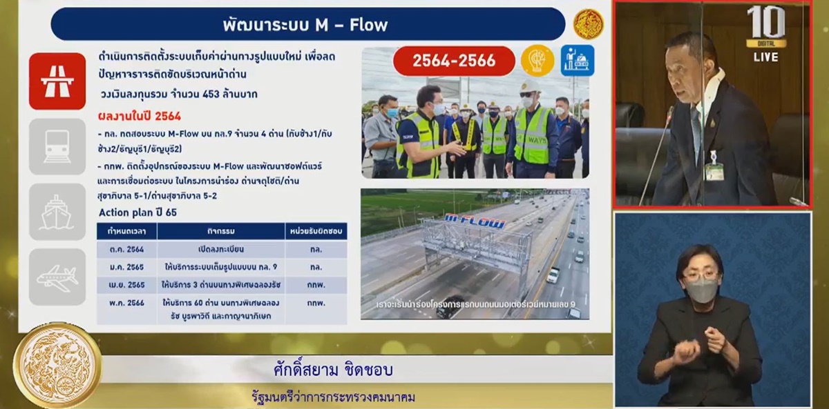 นายศักดิ์สยาม ยังกล่าวถึงการเพิ่มประสิทธิภาพในการเดินทางของประชาชนที่ขณะนี้ได้พัฒนาระบบผ่านทางหลวงพิเศษแบบไม่มีไม้กั้น หรือ M-Flow เพื่อลดปัญหาติดขัดของการจราจร โดยเริ่มนำร่องที่ด่านทับช้าง 1 ด่านทับช้าง 2 ด่านธัญบุรี 1 และด่านธัญบุรี 2 ซึ่งรถสามารถเคลื่อนผ่านได้เร็วกว่าเดิมประมาณ 5 เท่า คือ ชั่วโมงละ 2,500 คัน และจะขยายผลต่อไปอีกในด้านอื่นๆ โดยในปี 2565-2566 จะขยายได้เต็มพื้นที่
