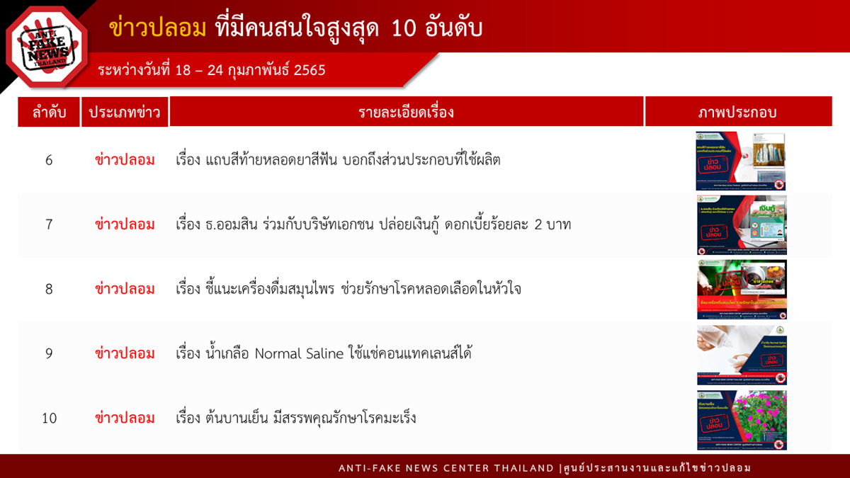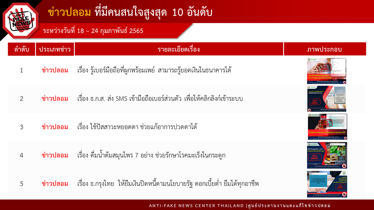 โดยมีข่าวปลอมที่คนสนใจสูงสุด 10 อันดับแรก ได้แก่ 1. รู้เบอร์มือถือที่ผูกพร้อมเพย์ สามารถรู้ยอดเงินในธนาคารได้ 2. ธ.ก.ส. ส่ง SMS เข้ามือถือเบอร์ส่วนตัว เพื่อให้คลิกลิงก์เข้าระบบ 3. ใช้ปัสสาวะหยอดตา ช่วยแก้อาการปวดตาได้ 4. ดื่มน้ำต้มสมุนไพร 7 อย่าง ช่วยรักษาโรคมะเร็งในกระดูก 5. ธ.กรุงไทย ให้ยืมเงินปิดหนี้ตามนโยบายรัฐ ดอกเบี้ยต่ำ ยืมได้ทุกอาชีพ
