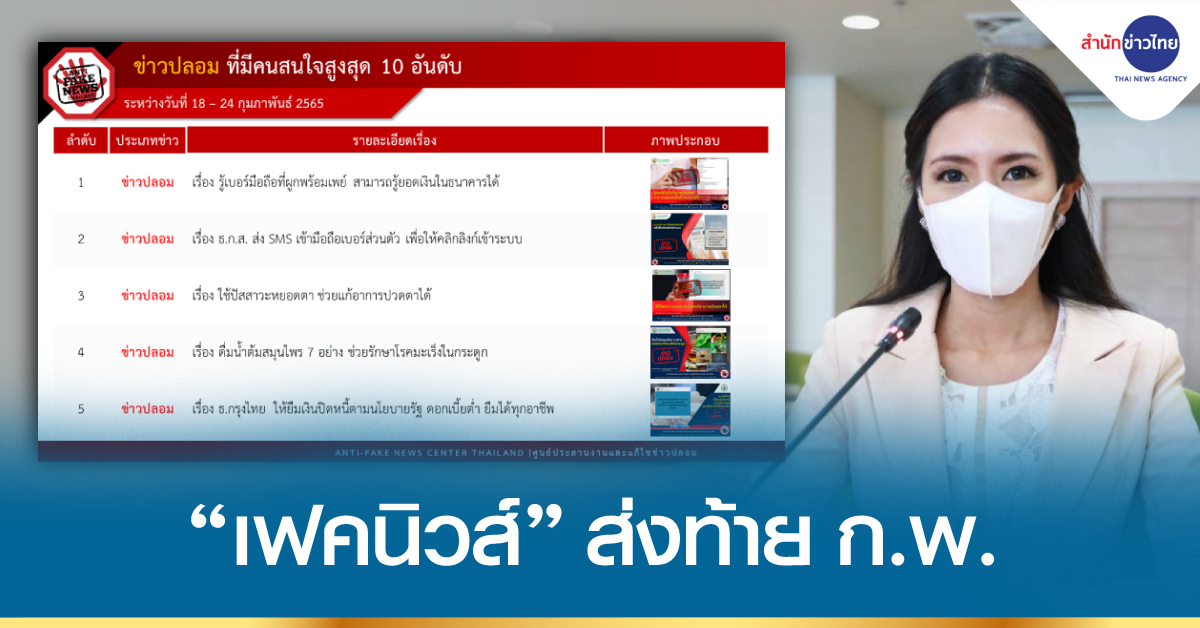 กรุงเทพฯ 27 ก.พ. – โฆษกดีอีเอส เผยสถานการณ์ “เฟคนิวส์” ส่งท้ายเดือน ก.พ.65 ข่าวสุขภาพ-การเงิน คนสนใจมากสุด