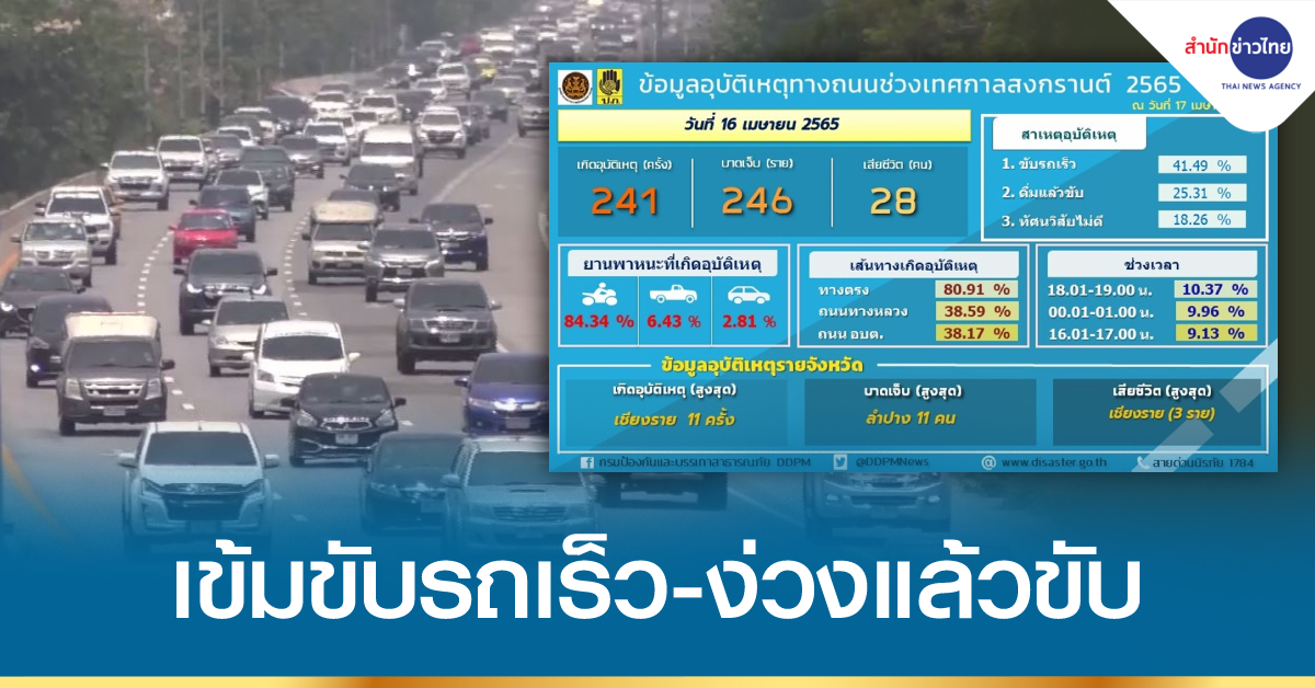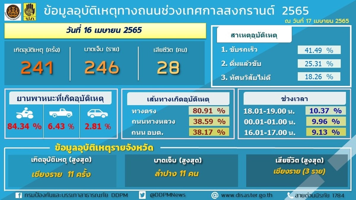 ผู้สื่อข่าวรายงานว่า กรมป้องกันและบรรเทาสาธารณภัย ศูนย์อำนวยการป้องกันและลดอุบัติเหตุทางถนนช่วงเทศกาลสงกรานต์ พ.ศ. 2565 สรุปสถิติอุบัติเหตุทางถนน ประจำวันที่ 16 เมษายน 2565 เกิดอุบัติเหตุ 241 ครั้ง ผู้บาดเจ็บ 246 คน ผู้เสียชีวิต 28 ราย สถิติอุบัติเหตุสะสม 6 วัน (11-16 เมษายน 2565) เกิดอุบัติเหตุรวม 1,720 ครั้ง ผู้บาดเจ็บ 1,696 คน ผู้เสียชีวิต 237 ราย เน้นดูแลความปลอดภัยในการใช้รถใช้ถนนในเส้นทางสายหลักและสายรอง โดยพิจารณาเปิดช่องทางพิเศษ ปิดจุดกลับรถ ประชาสัมพันธ์เส้นทางเลี่ยง ทางลัด เพื่อให้การสัญจรเป็นไปด้วยความคล่องตัว มุ่งเฝ้าระวังจุดเสี่ยงอุบัติเหตุ ทั้งจุดตัดทางรถไฟ ทางแยก ทางร่วม และบริเวณที่มีการก่อสร้างถนน พร้อมดูแลเส้นทางตรงที่มีระยะทางยาว เพื่อป้องกันการขับรถเร็วเกินกว่ากฎหมายกำหนด อีกทั้งเพิ่มความถี่ในการเรียกตรวจความพร้อมของผู้ขับขี่ยานพาหนะ เพื่อป้องกันอุบัติเหตุทางถนนจากการหลับใน ทั้งนี้ เพื่อสร้างการสัญจรปลอดภัยช่วงเทศกาลสงกรานต์ ภายใต้การรณรงค์ “ชีวิตวิถีใหม่ ขับขี่อย่างปลอดภัย ไร้อุบัติเหตุ”