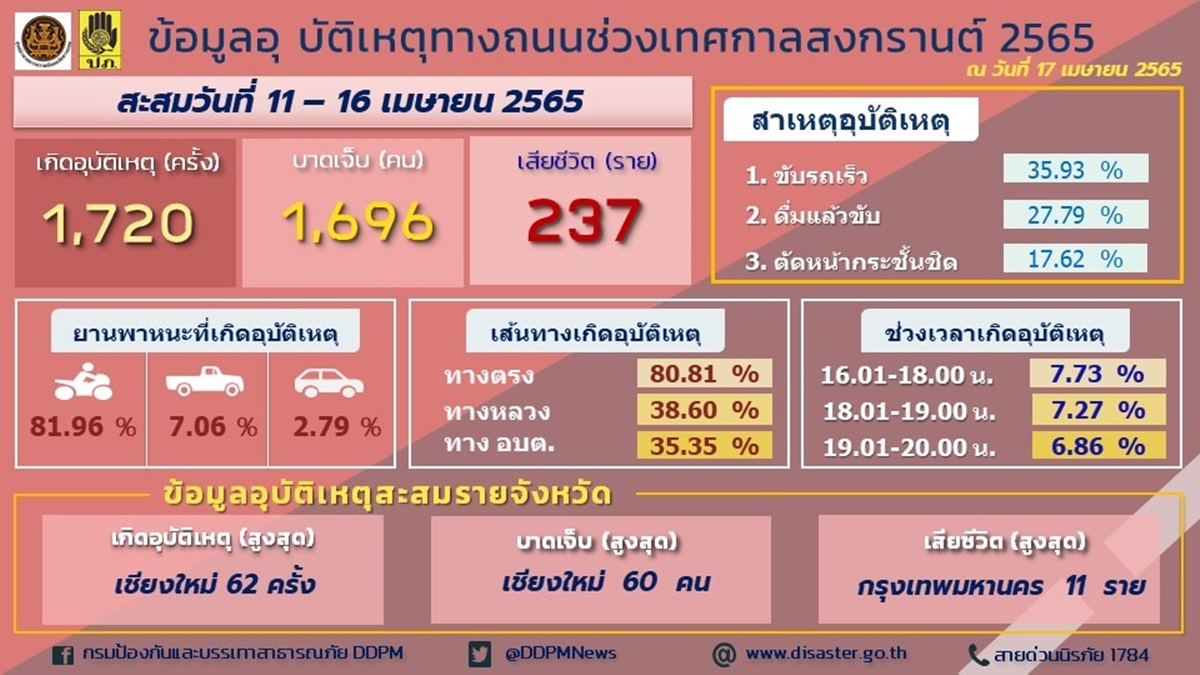 สรุปสถิติอุบัติเหตุทางถนนสะสม 6 วัน (วันที่ 11-16 เมษายน 2565) เกิดอุบัติเหตุรวม 1,720 ครั้ง ผู้บาดเจ็บ 1,696 คน ผู้เสียชีวิต 237 ราย จังหวัดที่เกิดอุบัติเหตุสะสมสูงสุด ได้แก่ เชียงใหม่ (62 ครั้ง) จังหวัดที่มีผู้บาดเจ็บสะสมสูงสุด ได้แก่ เชียงใหม่ (60 คน) จังหวัดที่มีผู้เสียชีวิตสะสมสูงสุด ได้แก่ กรุงเทพมหานคร (11 ราย) จังหวัดที่ไม่มีผู้เสียชีวิตรวม 10 จังหวัด ได้แก่ นครพนม บึงกาฬ ปัตตานี ยะลา ระนอง ลำพูน สมุทรสงคราม สิงห์บุรี หนองบัวลำภู และอำนาจเจริญ
