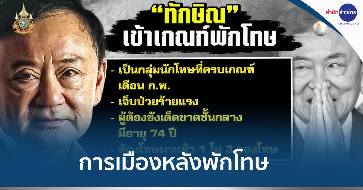 กรุงเทพฯ 17 ก.พ. – การพักโทษของนายทักษิณ ชินวัตร อดีตนายกรัฐมนตรี ในวันพรุ่งนี้ (18 ก.พ.) ถูกจับตาส่งผลอย่างไรต่อรัฐบาล จะนำไปสู่การปรับ ครม. หรือมีเหตุการณ์ชุมนุมประท้วงหรือไม่. -สำนักข่าวไทย