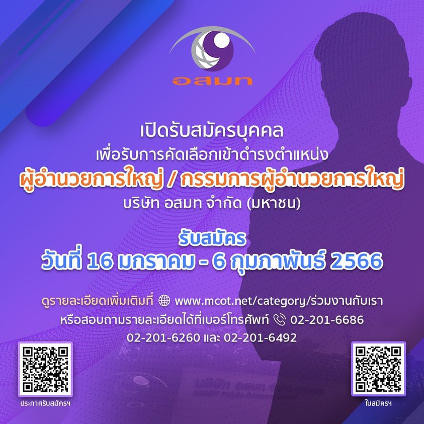 บริษัท อสมท จำกัด (มหาชน) เปิดรับสมัครบุคคลเพื่อคัดเลือกเข้าดำรงตำแหน่ง ผู้อำนวยการใหญ่ / กรรมการผู้อำนวยการใหญ่