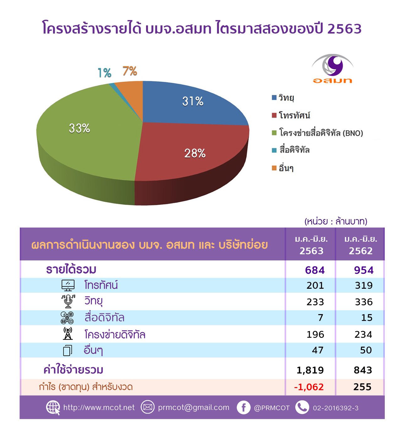 สำหรับผลประกอบการไตรมาส 2 ปี 2563 ธุรกิจการให้บริการโครงข่ายโทรทัศน์ภาคพื้นดินระบบดิจิทัล (BNO) และการให้บริการเช่าช่องสัญญาณโทรทัศน์ดาวเทียม (MCOT Satellite Network) สร้างรายได้ร้อยละ 33 ธุรกิจวิทยุร้อยละ 31 ธุรกิจโทรทัศน์ร้อยละ 28 ธุรกิจดิจิทัลร้อยละ 1 รายได้อื่นๆ ร้อยละ 7 อย่างไรก็ตาม ธุรกิจโทรทัศน์และธุรกิจวิทยุยังคงเป็นธุรกิจหลักของบริษัท