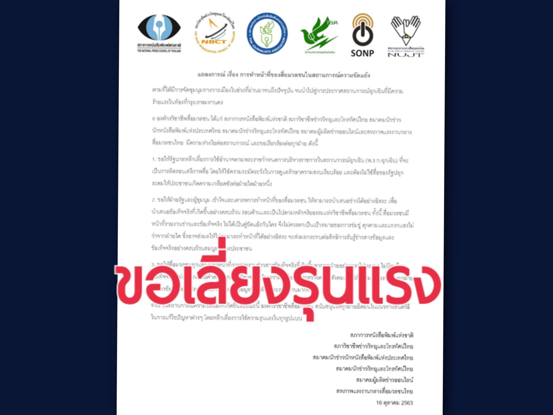 ทั้งนี้ ในสถานการณ์ความขัดแย้งที่เกิดขึ้นในขณะนี้ องค์กรวิชาชีพสื่อมวลชน สนับสนุนให้ทุกฝ่ายยึดมั่นในแนวทางสันติวิธีในการแก้ไขปัญหาต่างๆ โดยหลีกเลี่ยงการใช้ความรุนแรงในทุกรูปแบบ