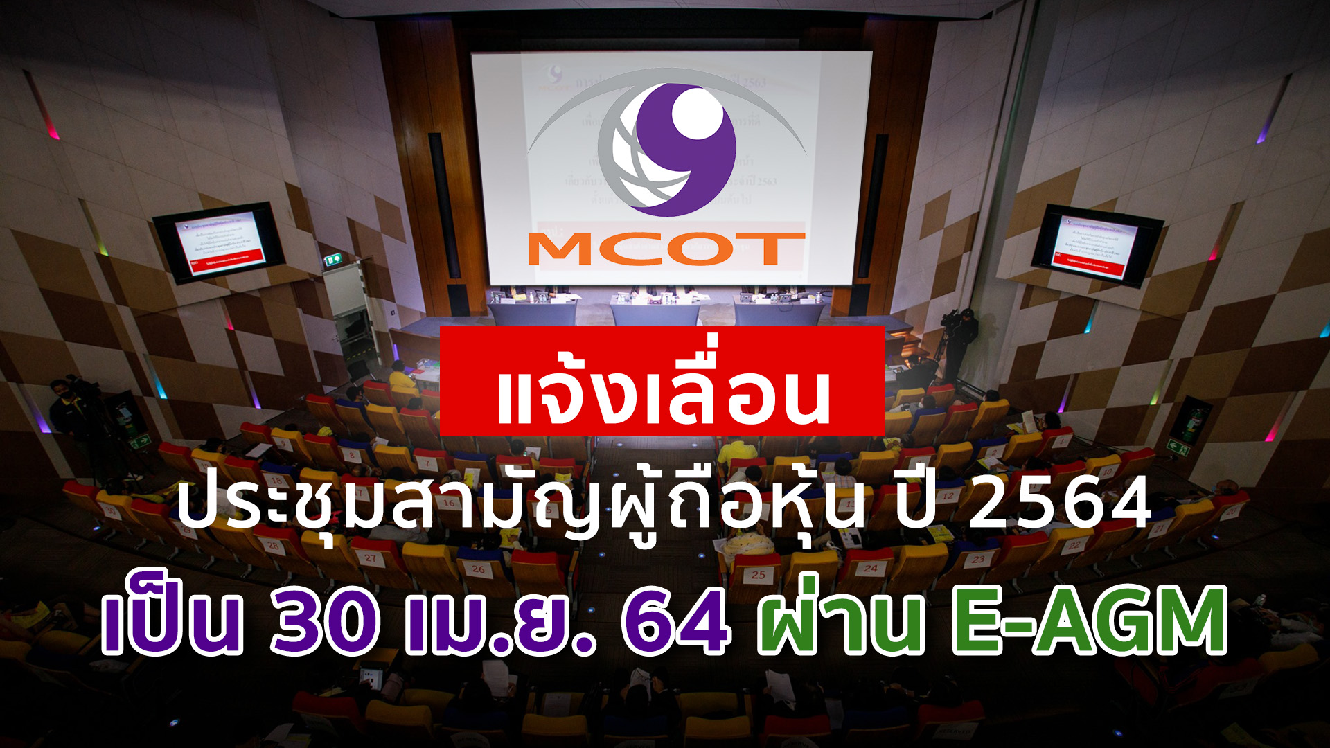 เนื่องจากสถานการณ์แพร่ระบาดของโรคติดเชื้อไวรัสโคโรนา 2019 (COVID – 19) ที่มีแนวโน้มจำนวนผู้ติดเชื้อสูงขึ้น และมีการแพร่กระจายอย่างรวดเร็ว บริษัท อสมท จำกัด (มหาชน) ขอแจ้งเลื่อนกำหนดการประชุมสามัญผู้ถือหุ้น ประจำปี 2564 จากเดิมวันที่ 22 เมษายน 2564 เวลา 13.30 น. เป็นวันที่ 30 เมษายน 2564 เวลา 10.00 น. ในรูปแบบการประชุมผ่านสื่ออิเล็กทรอนิกส์ (E-AGM) เท่านั้น