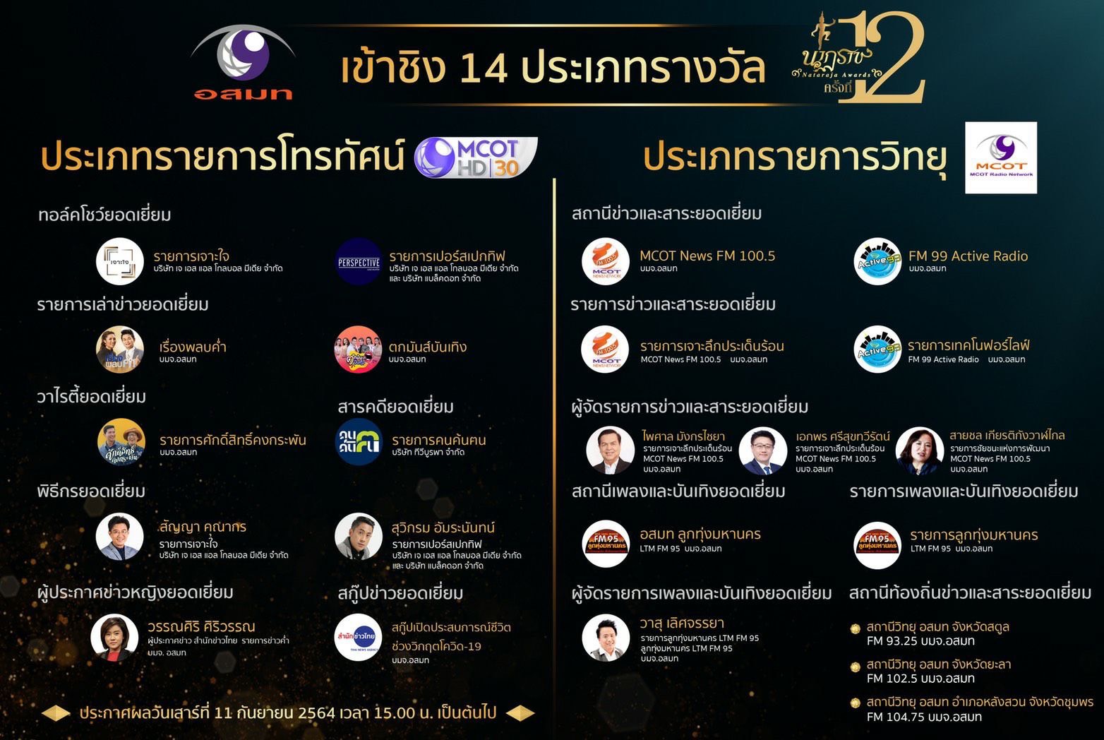 🎉 รางวัล “นาฏราช” จัดโดย “สมาพันธ์สมาคมวิชาชีพวิทยุกระจายเสียงและวิทยุโทรทัศน์” ที่มีสมาชิกเป็นองค์กรทั้งสถานีวิทยุกระจายเสียงและวิทยุโทรทัศน์ รวมถึงผู้ผลิตเนื้อหา การจัดประกาศผลรางวัล “นาฏราช” ครั้งที่ 12 พิจารณาผลงานของปี 2563
