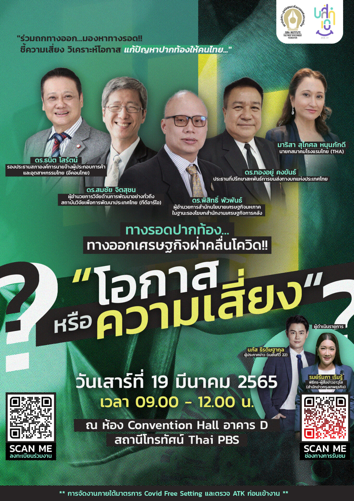 ภาครัฐ ประชาชน ภาคธุรกิจ ภาควิชาการ ร่วมถกทางออก มองหาทางรอด ชี้ความเสี่ยง วิเคราะห์โอกาส เพื่อพลิกฟื้นเศรษฐกิจ แก้ปัญหาปากท้องให้คนไทย โดยมีวิทยากร 5 คน ประกอบด้วย ดร.พิสิทธิ์ พัวพันธ์ ผอ.สำนักนโยบายเศรษฐกิจมหภาค ในฐานะรองโฆษกสำนักงานเศรษฐกิจการคลัง ดร.สมชัย จิตสุชน ผู้อำนวยการวิจัยด้านการพัฒนาอย่างทั่วถึง สถาบันวิจัยเพื่อการพัฒนาประเทศไทย ดร.ธนิต โสรัตน์ รองประธานสภาองค์การนายจ้างผู้ประกอบการค้า และอุตสาหกรรมไทย นางมาริสา สุโกศล หนุนภักดี นายกสมาคมโรงแรมไทย (THA) และ ดร.ทองอยู่ คงขันธ์ ประธานที่ปรึกษา สหพันธ์การขนส่งทางบกแห่งประเทศไทย ร่วมพูดคุยหาทางออกวิกฤตเศรษฐกิจในหลายมิติ