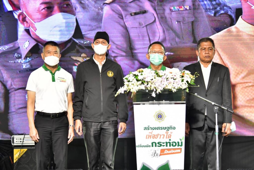 วันที่ 25 สิงหาคม 2565 เวลา 16.30 น. ที่โรงแรมทวินโลตัส อ.เมือง จ.นครศรีธรรมราช นายสมศักดิ์ เทพสุทิน รมว.ยุติธรรม พร้อมด้วย นายวิชัย ไชยมงคล เลขาธิการ ป.ป.ส. ซ้อนท้ายขบวนมอเตอร์ไซค์ Harley Davidson ไปเปิดงาน“สร้างเศรษฐกิจเพื่อชาวใต้ เปลี่ยนพืชกระท่อม เป็นเงินสด” ที่ตลาดลีวัฒนา โดยมี นายสมพงษ์ มากมณี รองผู้ว่าราชการจังหวัดนครศรีธรรมราช นายธีระยุทธ วานิชชัง ผู้ช่วย รมว.อุตสาหกรรม พล.ต.ต.สมชาย ซื่อต่อตระกูล ผบก.ภ.จว.นครศรีธรรมราช นายสัณหพจน์ สุขศรีเมือง นายสายัณห์ ยุติธรรม ส.ส.นครศรีธรรมราช พรรคพลังประชารัฐ นายยงยศ แก้วเขียว ประธานชมรมกำนัน ผู้ใหญ่บ้านแป่งประเทศไทย และประชาชนร่วมงาน