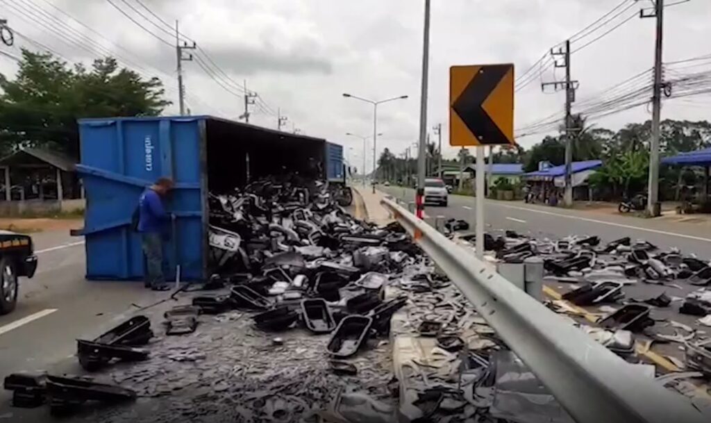 นาทีระทึก รถบรรทุกพ่วง 18 ล้อ หลุดโค้ง เศษเหล็กเกือบ 20 ตัน หล่นกระจายเกลื่อนถนนบ้านวังเย็น ถนนหลวง 3121 เส้นบางคล้า แปลงยาว ช่วงโค้งหักศอกบ้านวังเย็น ต.วังเย็น อ.แปลงยาว จ.ฉะเชิงเทรา ขณะเตรียมนำเศษเหล็กไปส่งโรงงานเตาหลอม ในพื้นที่ ต.หนองแหน ตำรวจต้องปิดการจราจรชั่วคราว ให้ใช้ทางเบี่ยงร่วม
