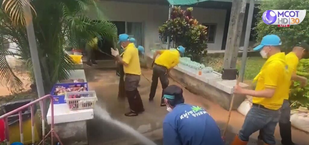 จ.ลำปาง วันนี้ยังมีฝนกระจาย 60% ของพื้นที่ ล่าสุดผู้บัญชาการมณฑลทหารบกที่ 32 นำกำลังทหาร ตำรวจ จิตอาสา พร้อมอุปกรณ์ทำความสะอาด เข้าไปที่โรงพยาบาลแจ้ห่ม หลังถูกน้ำป่าไหลท่วมอย่างหนัก ทำความสะอาดทั้งภายในและภายนอกอาคาร พบว่ามีเศษกิ่งไม้ เศษโคลน ถูกกระแสน้ำซัดเข้ามาทับถมเป็นจำนวนมาก ซึ่งพร้อมเปิดให้บริการผู้ป่วยและประชาชนทั่วไปแล้ว โดยจัดเวรยามเฝ้าระวังสถานการณ์ หากเกิดน้ำป่าไหลหลากเข้ามาซ้ำ อาจจะย้ายผู้ป่วยไปที่โรงพยาบาลอำเภอเมืองปาน จ.ลำปาง ที่อยู่ใกล้เคียง