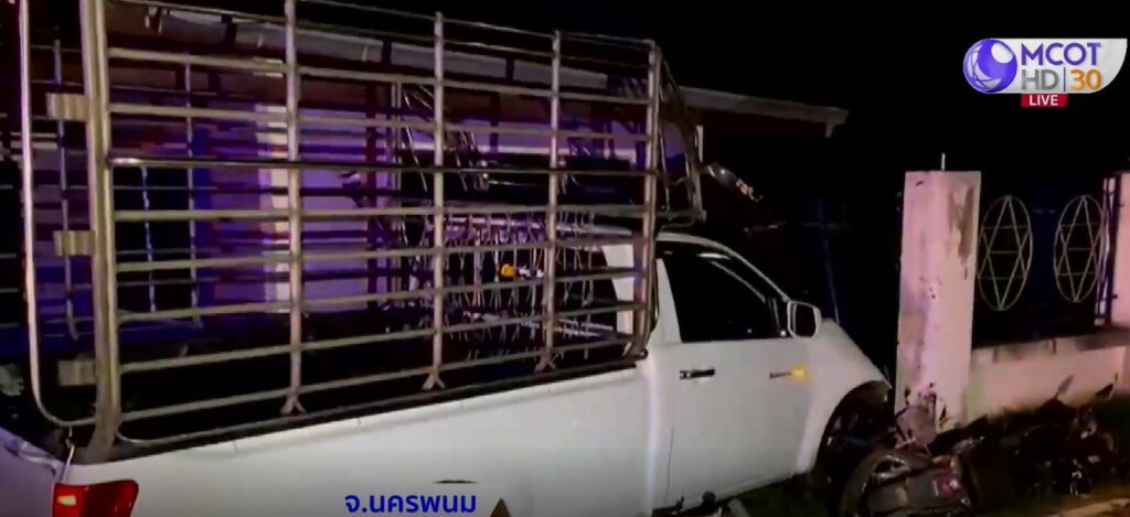 กรณีเกิดอุบัติเหตุรถกระบะสีขาวเสียหลักพุ่งชนบ้านเรือนชาวบ้านริมถนน ในหมู่บ้าน บ.หัวโพน ต.นาทราย อ.เมือง จ.นครพนม พร้อมชนจักรยานยนต์สีดำเสียหายทั้งคัน ทำให้เยาวชนอายุ 17-18 ปี 2 คน บาดเจ็บ ส่วนวัยรุ่นอีกคนที่ซ้อนท้ายจักรยานยนต์วิ่งหลบหนีไป