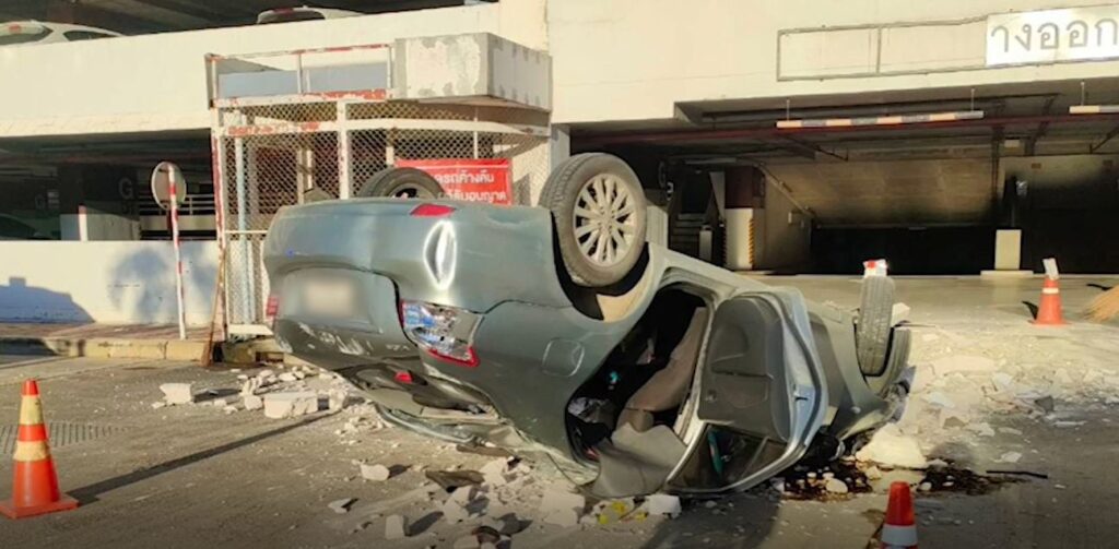 เหตุการณ์นี้เกิดขึ้นในช่วงเช้าที่ผ่านมา โดยตำรวจ สภ.บางบัวทอง จ.นนทบุรี ได้รับแจ้งมีรถเก๋งตกอาคารลานจอดรถของศูนย์การค้าแห่งหนึ่งใน ต.บางรักพัฒนา อ.บางบัวทอง จึงรุดไปตรวจสอบที่เกิดเหตุ พบว่าบริเวณชั้นล่างลานจอดรถด้านหลัง มีรถเก๋งสีบรอนซ์เงิน ทะเบียนกรุงเทพมหานคร อยู่ในสภาพหงายท้องล้อชี้ฟ้า โดยมีเศษปูนกำแพงของอาคารจอดรถหล่นลงมาเกลื่อนพื้น และพบกำแพงมีรอยถูกชนเสียหายกว้างประมาณ 5 เมตร