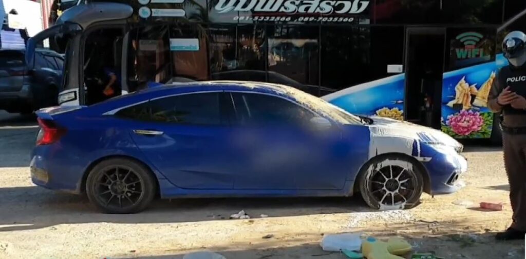 รถเก๋ง ฮอนด้า Civic 2022 สีน้ำเงิน ป้ายทะเบียน กทม. ถูกมือมืดสาดสีขาวใส่รถ รวมไปถึงดิน กรวด สาดใส่ เรียกว่า “เละ” เกือบทั้งคัน แถมยังเขียนข้อความด่าไว้อีก ส่วนล้อรถยนต์ก็ถูกปล่อยลมยางจนบี้แบนทั้ง 4 ล้อ โดยรถคันนี้เป็นของ น.ส.เขมจิรา อายุ 24ปี ชาว จ.เพชรบุรี อาชีพ PR ชงเหล้า เหตุเกิดภายในหมู่บ้านชัชพีย์ พลูวิลล่า ต.ชะอำ อ.ชะอำ จ.เพชรบุรี