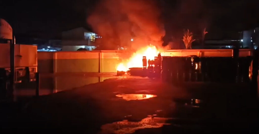 ส่วนด้านโรงงาน เพลิงลุกไหม้อย่างรุนแรง ทั้งตัวอาคาร ถังก๊าซ ยางรถยนต์ที่ใช้รองถังก๊าซ และรถยนต์ที่บรรทุกถังก๊าซ ด้านในโรงงานมีถังก๊าซขนาดใหญ่ เจ้าหน้าที่สั่งอพยพและปิดกั้นพื้น เนื่องจากยังคงมีกลิ่นก๊าซรั่วไหลรุนแรง ใช้เวลากว่า 1 ชั่วโมงจึงควบคุมสถานการณ์และปิดวาล์วก๊าซได้