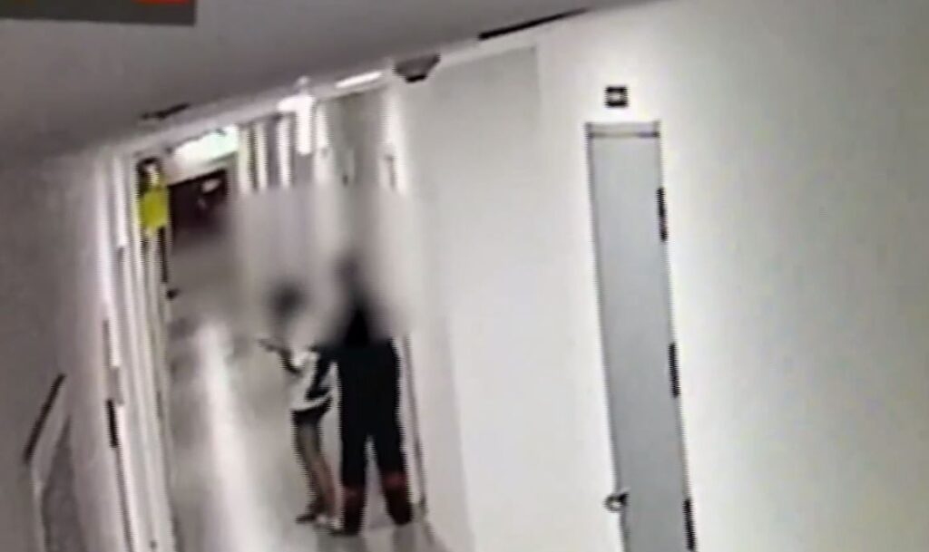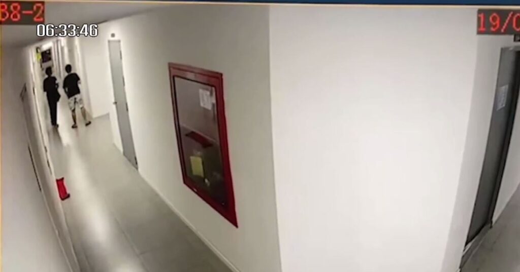 ต่อมามีชายสองคนเดินวนเวียนไป-มาบริเวณหน้าห้องพัก โดยคนหนึ่งกำลังคุยโทรศัพท์มือถือด้วย ก่อนที่ชายคนหนึ่งจะหยุดหน้าห้องพักที่เกิดเหตุ ทันใดนั้นชายที่เป็นช่างก็ออกจากห้องดังกล่าวมา แล้วหญิงสาวก็ตามออกมายืนอยู่บริเวณหน้าห้อง ก่อนจับแขนชายที่ตามมาเข้าห้องพัก โดยทางช่างมีการยกมือชี้แล้วพูดจาคล้ายต่อว่าก่อนเดินออกมาจากห้องพักดังกล่าว