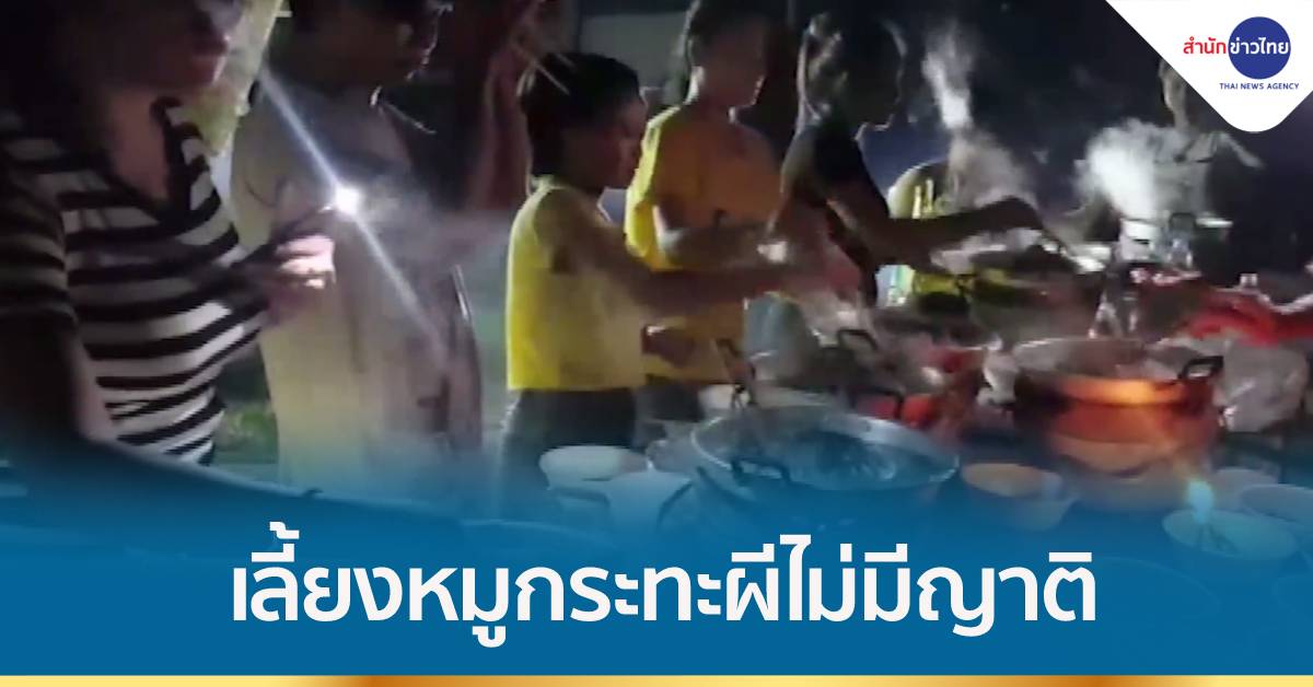 กลางดึกเมื่อคืนนี้ ที่สุสานไตรคุณธรรมชลบุรี ต.หนองรี อ.เมือง จ.ชลบุรี มีกลุ่มนักธุรกิจร้านหมูกระทะชื่อดังและเป็นเจ้าของธุรกิจหลายแห่งในจังหวัดชลบุรี พร้อมลูกน้องและกลุ่มนักเสี่ยงโชค ต่างช่วยกันย่างหมูกระทะเพื่อให้ผีไม่มีญาติรับประทาน แถมยังตำส้มตำกันสดๆ ข้างหลุม ตักไอศกรีมวางไว้บนหลุมศพ