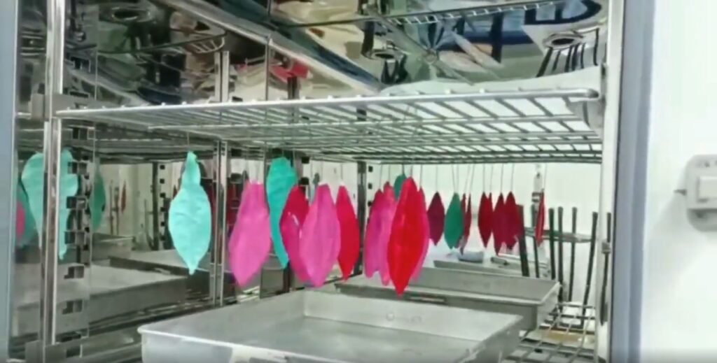เริ่มจากการผสมน้ำยางกับสารเคมี ก่อนเติมสีสันตามต้องการ จากนั้นตัดกระดาษทิชชูเป็นกลีบดอกไม้ แล้วคลี่กระดาษเป็น 2 ส่วน ก่อนใช้ลวดพันก้านวางระหว่างกระดาษแผ่นล่างและแผ่นบน นำกลีบดอกจุ่มในน้ำยางช้าๆ แล้วค่อยๆ ดึงขึ้นก่อนนำกลีบไปอบในตู้อบลมร้อน ที่อุณหภูมิ 70-80 องศาเซลเซียส เป็นเวลา 10 นาที แล้วนำออกจากตู้อบ วางที่อุณหภูมิห้องประมาณ 10-15 นาที ให้กลีบดอกเย็น แล้วประกอบเป็นช่อดอกตามขนาดและรูปแบบที่ต้องการได้อย่างสวยงาม
