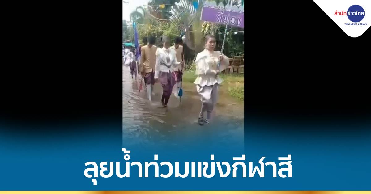 น้องๆ นักเรียนตัวเล็กๆ ก็จะมีผู้ปกครองช่วยอุ้มหนีน้ำ ซึ่งแต่ละคนจัดเต็มแต่งตัวมาอย่างสวยงาม มีทั้งดัมเมเยอร์ เชียร์ลีดเดอร์ แต่งตัวแฟนซี แต่ก็ไม่หวั่น ลุยน้ำเข้าไปในโรงเรียนให้ได้ ส่วนสภาพสนามในโรงเรียนแม้ไม่มีน้ำท่วม แต่ก็เฉอะแฉะอย่างที่เห็น แต่ก็ไม่เป็นอุปสรรคในการจัดการแข่งขันกีฬาสีของโรงเรียน.-สำนักข่าวไทย