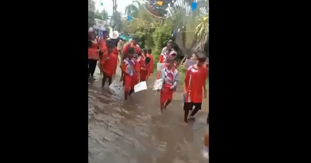 ที่ จ.ตรัง เมื่อคืนนี้ฝนตกหนัก เช้ามาสภาพเป็นอย่างที่เห็น น้ำท่วมขังหลายจุด รวมทั้งที่โรงเรียนบ้านเกาะมุกด์ แต่ทำไงได้ วันนี้มีการแข่งกีฬาสีของโรงเรียน นักเรียนชั้นอนุบาลและชั้นประถมศึกษาเกือบ 100 คน รวมทั้งผู้ปกครองนักเรียน ต้องพาเหรดเดินลุยน้ำที่ท่วมขังเพื่อไปแข่งขันกีฬาสี