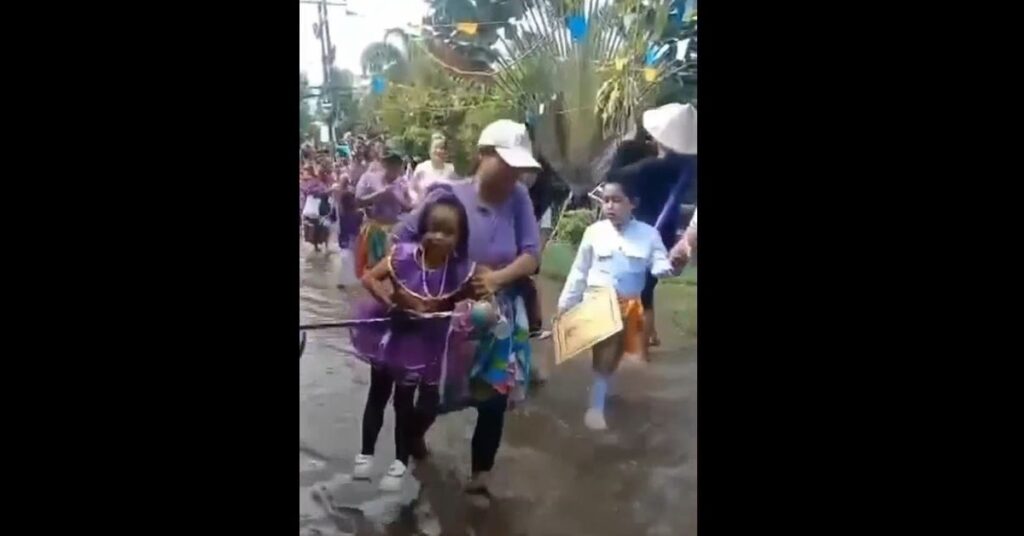 ตรัง 9 ก.ย.- ฝนตกน้ำท่วมไม่เป็นอุปสรรค น้องๆ นักเรียนโรงเรียนบ้านเกาะมุกด์ ต.เกาะลิบง อ.กันตัง จ.ตรัง แต่งตัวสวยหล่อลุยน้ำไปแข่งขันกีฬาสีของโรงเรียน