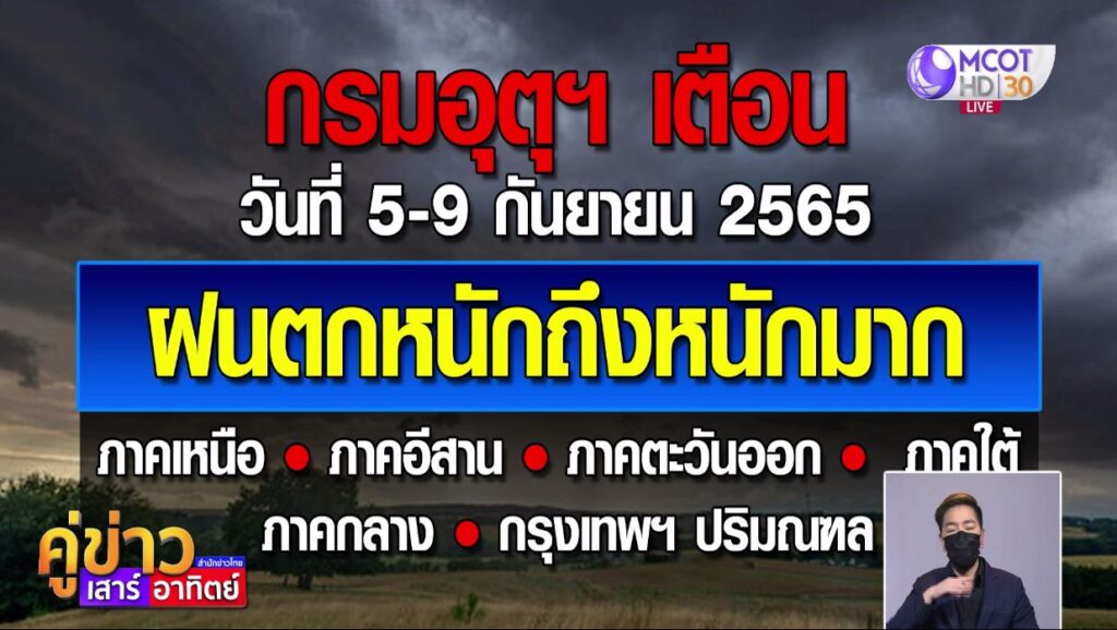 โดยในช่วงวันที่ 5-9 กันยายน 2565 ร่องมรสุมกำลังแรงจะเลื่อนลงมาพาดผ่านภาคเหนือตอนล่าง ภาคกลางตอนบน และภาคตะวันออกเฉียงเหนือ ประกอบกับมรสุมตะวันตกเฉียงใต้ที่พัดปกคลุมทะเลอันดามัน ภาคใต้ และอ่าวไทยจะมีกำลังแรงขึ้น ลักษณะเช่นนี้ทำให้ประเทศไทยมีฝนเพิ่มขึ้นและมีฝนตกหนักถึงหนักมากบางแห่งในภาคเหนือ ภาคตะวันออกเฉียงเหนือ ภาคกลาง รวมทั้งกรุงเทพมหานครและปริมณฑล ภาคตะวันออก และภาคใต้ ขอให้ประชาชนบริเวณดังกล่าวระวังอันตรายจากฝนตกหนักถึงหนักมากและฝนที่ตกสะสม ซึ่งอาจทำให้เกิดน้ำท่วมฉับพลันและน้ำป่าไหลหลาก โดยเฉพาะพื้นที่ลาดเชิงเขาใกล้ทางน้ำไหลผ่านและพื้นที่ลุ่ม