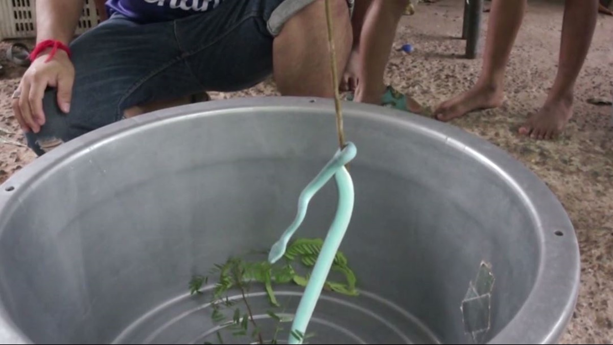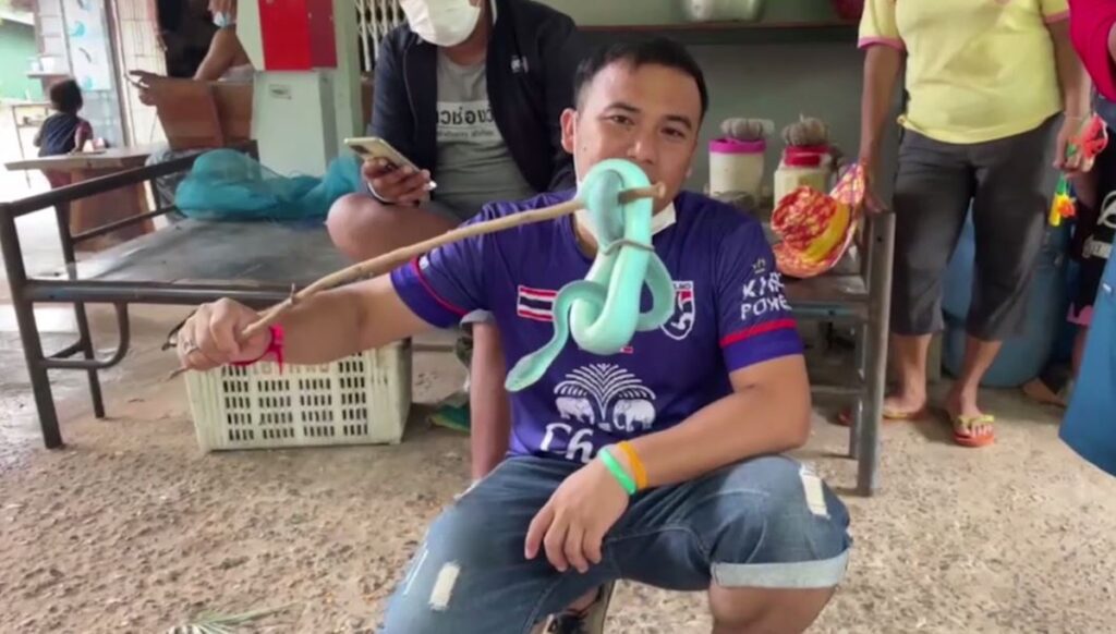 นายประดิษฐ์ โดนสูงเนิน อายุ 45 ปี ชาวบ้านที่พบเห็นงูประหลาด บอกว่า ไม่เคยเห็นงูลักษณะนี้มาก่อน และไม่ทราบสายพันธุ์ โดยพบงูตัวนี้เลื้อยอยู่บนต้นไม้หลังฟาร์มไก่ ตนเห็นติดต่อกัน 3 วันซ้อน จึงถ่ายคลิปวิดีโอไว้ ก่อนใช้ไม้สอยจับมาเลี้ยงไว้ที่บ้าน ชาวบ้านที่ทราบข่าวพากันมาดูกับตา ตอนเเรกไม่มีใครเชื่อ คิดว่าเป็นงูของเล่น แต่เมื่อดูชัดๆ พบว่าเป็นงูจริง โดยงูตัวนี้เลื้อยไปมาอย่างเชื่องช้า ชาวบ้านเชื่อว่า เป็นงูเจ้าที่มาให้โชคลาภ บางคนตีเป็นเลขเด็ดตามความเชื่อ หลังจากนี้เตรียมนำไปปล่อยกลับคืนสู่ธรรมชาติ. – สำนักข่าวไทย