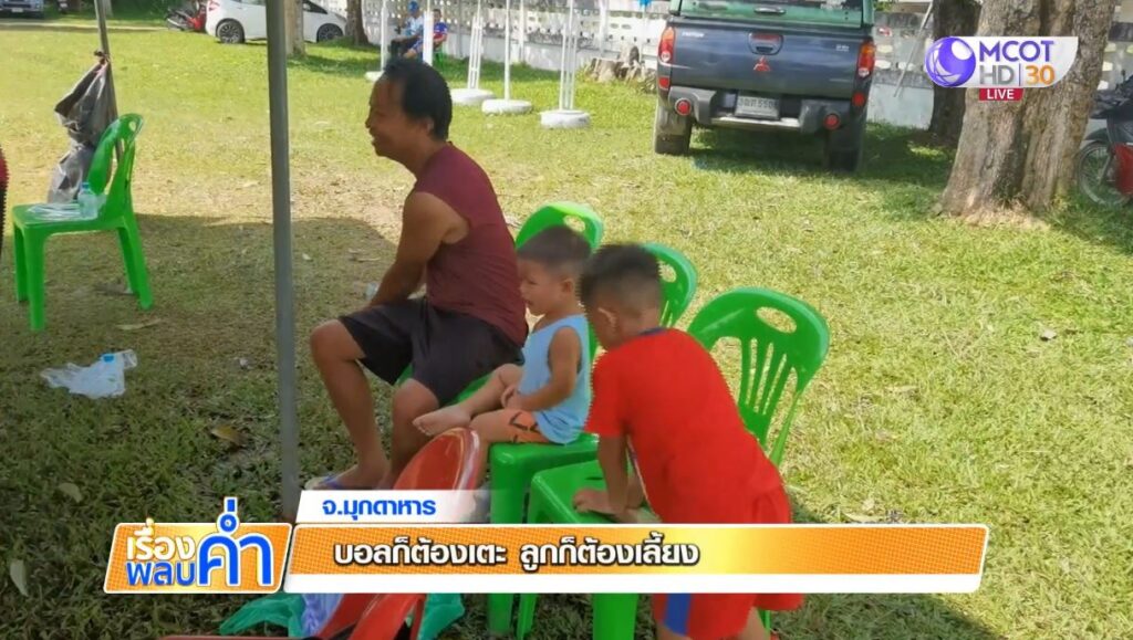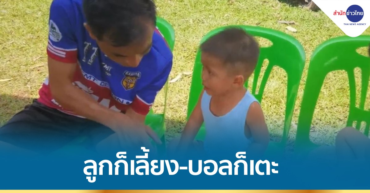 โดยก่อนลงสนามให้คนพี่ดูแลน้อง ซึ่งหลังจากมอบหมายงานให้พี่ชายเรียบร้อยก็ลงสนามไป แต่ปรากฏว่าพอพ่อเดินลงสนามเท่านั้น ผู้เป็นน้องก็เริ่มร้องไห้หาพ่อทันที ซึ่งเพื่อนนักกีฬาและกลุ่มกองเชียร์ก็พยามเข้ามาปลอบทั้งเอาพัดลมมาเป่า อีกคนก็ใช้วิธีเอาโทรศัพท์ให้น้องดูการ์ตูน แต่ไม่เป็นผลน้องยังคงร้องไห้ต่อเนื่อง จนผู้จัดการทีมตัดสินใจเปลี่ยนตัวคุณพ่อออกมาเพื่อดูแลลูกชาย พอคุณพ่อออกมานอกสนาม เด็กคนดังกล่าวก็หยุดร้องไห้ทันที นี่จึงเป็นที่มาของคำว่า บอลก็ต้องเตะลูกก็ต้องเลี้ยงเป็นภาพความน่ารักที่ผู้สื่อข่าวนำมาฝากจากจังหวัดมุกดาหาร. -สำนักข่าวไทย