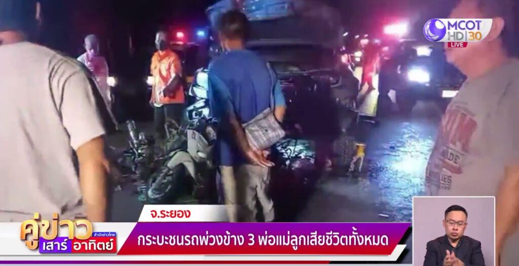 ระยอง 11 ก.ย. – อุบัติเหตุรถกระบะชน จยย.พ่วงข้าง ลากติดใต้ท้องรถไกล 200 เมตร สามพ่อแม่ลูกเสียชีวิต คนขับกระบะเผยจังหวะแซงแล้วจะกลับเข้าเลนซ้าย มองไม่เห็น จยย. พ่วงข้างด้านหน้า จึงพุ่งชน