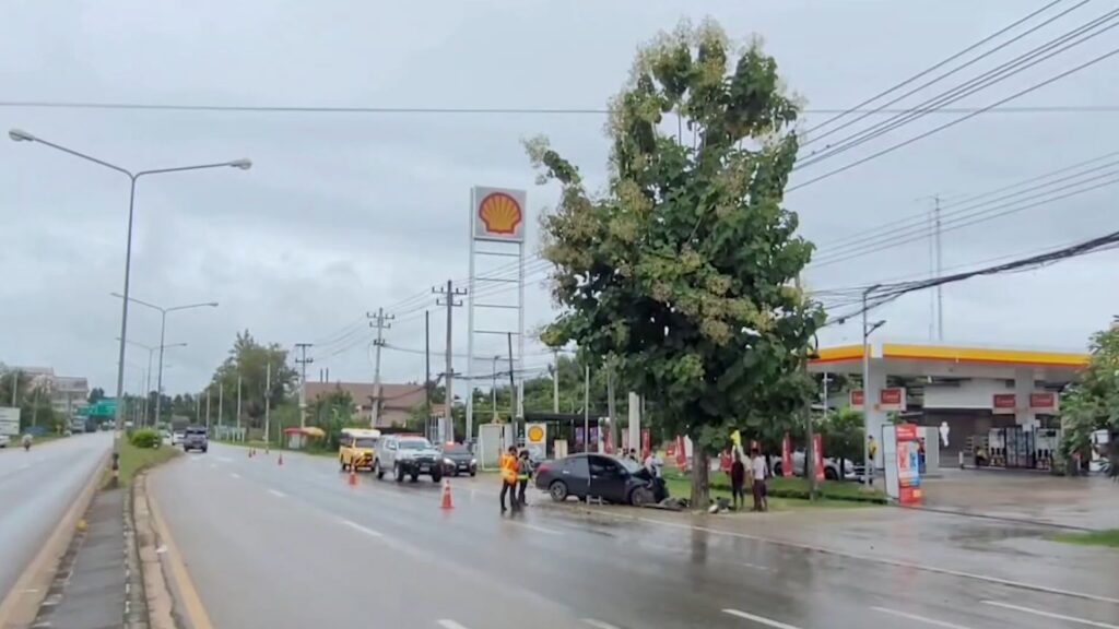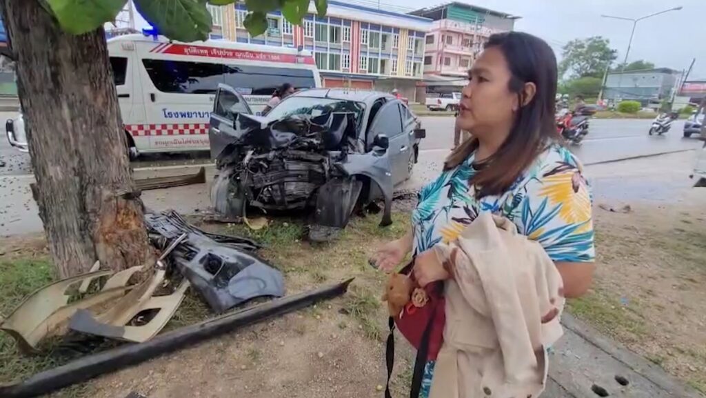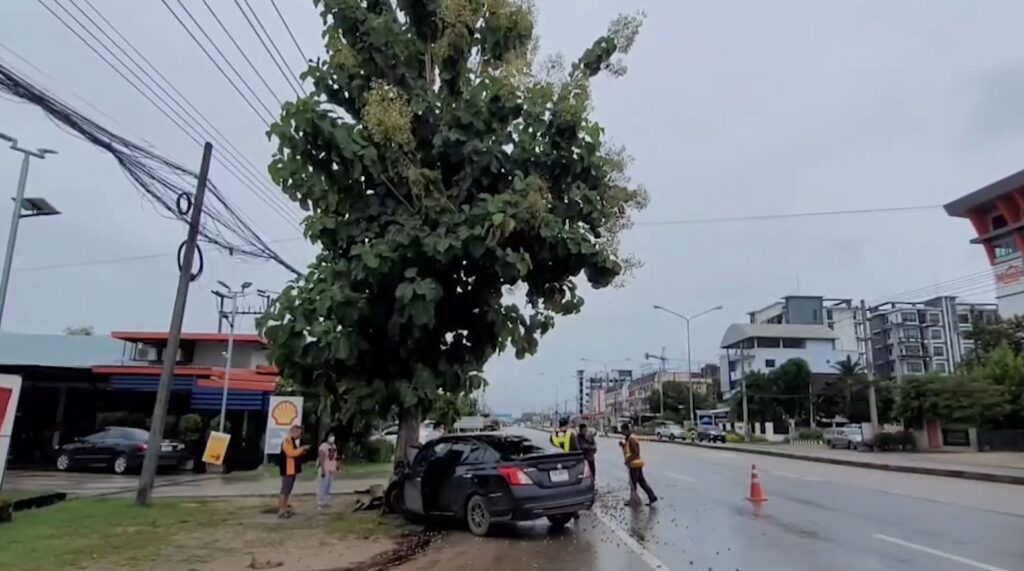 ตาก 11 ก.ย. – หนุ่มพนักงานโรงแรมออกเวรเช้ารีบขับรถกลับบ้านท่ามกลางฝนตก พุ่งชนต้นสักทองขนาดใหญ่ เสียชีวิต ก่อนถึงบ้านไม่ถึง 1 กม. ภรรยาร่ำไห้วิ่งมาดูใจสามีก่อนเสียชีวิต ชาวบ้านลืออาถรรพ์ต้นสักทอง ไม่มีใครกล้าตัด