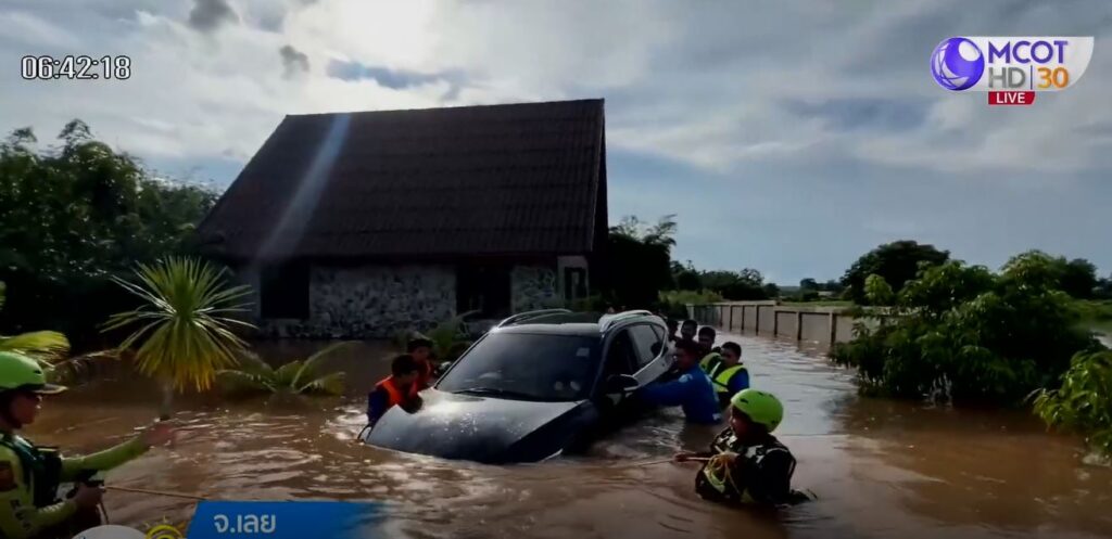เลย 12 ก.ย. – แม่น้ำเลยล้นตลิ่งท่วมบ้านเรือนประชาชน สูง 1.5 เมตร เจ้าหน้าที่เร่งกู้รถเก๋งจมน้ำอย่างทุลักทุเล ส่วน จ.สระแก้ว น้ำล้นคลองพระสะทึง ต้องย้ายศพขึ้นกระบะหนีน้ำ ขณะที่พัทยา ฝนถล่มนานกว่า 2 ชั่วโมง รถจมน้ำนับสิบคัน