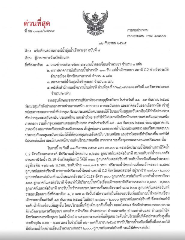 กรมชลประทานมีหนังสือแจ้งเตือนสถานการณ์น้ำลุ่มเจ้าพระยา ฉบับที่ 7 ลงวันที่ 12 กันยายน 2565 ไปยังผู้ว่าราชการ 11 จังหวัดลุ่มเจ้าพระยา ได้แก่ จังหวัดชัยนาท อุทัยธานี สิงห์บุรี อ่างทอง พระนครศรีอยุธยา สุพรรณบุรี ลพบุรี ปทุมธานี นนทบุรี สมุทรปราการ และกรุงเทพมหานคร ให้เตรียมพร้อมรับสถานการณ์และแจ้งเตือนประชาชนที่อาศัยอยู่ในพื้นที่ริมสองฝั่งแม่น้ำเจ้าพระยาและแม่น้ำน้อย เฝ้าระวังสถานการณ์น้ำอย่างใกล้ชิด เนื่องจากปริมาณน้ำที่ไหลหลากจากพื้นที่ภาคเหนือ ลงมาเขื่อนเจ้าพระยา มีปริมาณเพิ่มขึ้นต่อเนื่อง และกรมอุตุนิยมวิทยาคาดการณ์ว่าในช่วงวันที่14-17 กันยายนนี้