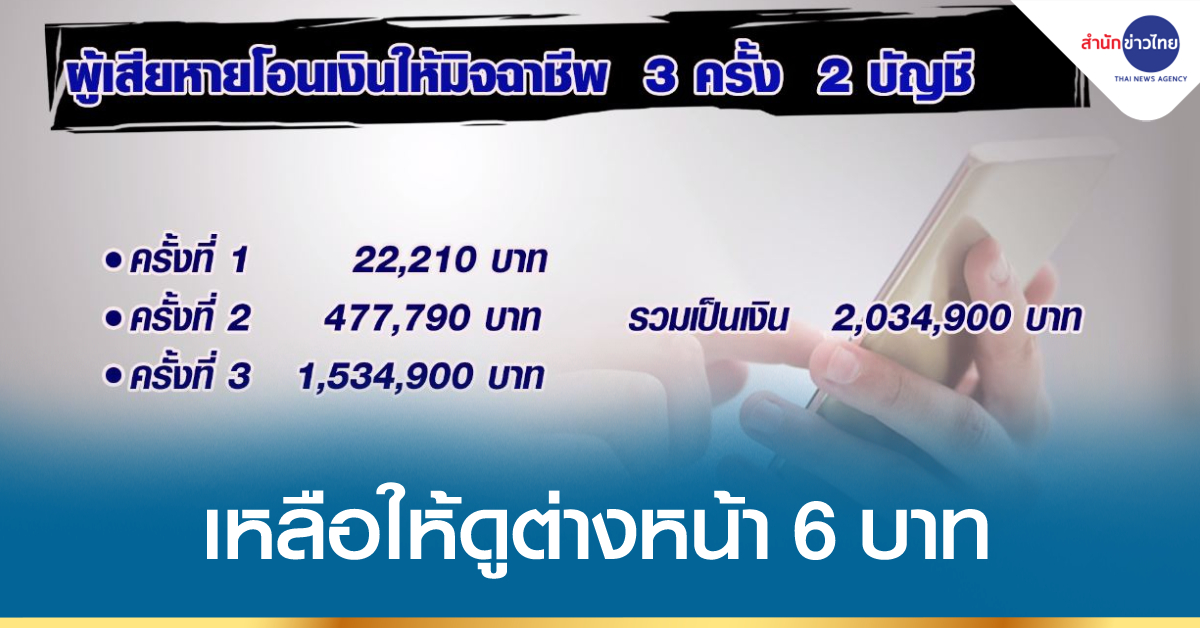 ระหว่างที่กำลังพูดคุยอยู่ ปรากฏว่ามีข้อความจากแอปฯ ของธนาคารเด้งขึ้นมา แจ้งว่ามีเงินในบัญชีธนาคารถูกโอนออกไปถึง 3 ครั้งติดต่อกัน ในระยะเวลาเพียง 7 นาที ครั้งแรก จำนวน 22,210 บาท ซึ่งเป็นบัญชีเงินเดือน ครั้งที่ 2 เงินออก 477,790 บาท และครั้งที่ 3 เงินออก 1,534,900 บาท โดย 2 ครั้งหลัง เป็นเงินในบัญชีที่เก็บสะสมไว้ รวมเป็นเงินทั้งสิ้น 2,034,900 บาท ทั้ง 2 บัญชี เป็นบัญชีที่ผูกกับแอปฯ ของธนาคาร ซึ่งภรรยาของตนได้มีการบันทึกข้อมูลบัญชีธนาคารทั้งหมดเอาไว้ในโทรศัพท์มือถือ ทำให้รู้ตัวว่าถูกแก๊งมิจฉาชีพหลอกดูดเงินในบัญชีธนาคาร จึงโทรศัพท์ไปแจ้งอายัดบัญชีไว้กับธนาคาร และได้รับคำแนะนำให้ไปแจ้งความร้องทุกข์กับเจ้าหน้าที่ตำรวจเอาไว้ก่อน ตนจึงเดินทางไปแจ้งความที่ สภ.คำผักกูด อ.กุดชุม จ.ยโสธร ในช่วงบ่ายวันเดียวกัน