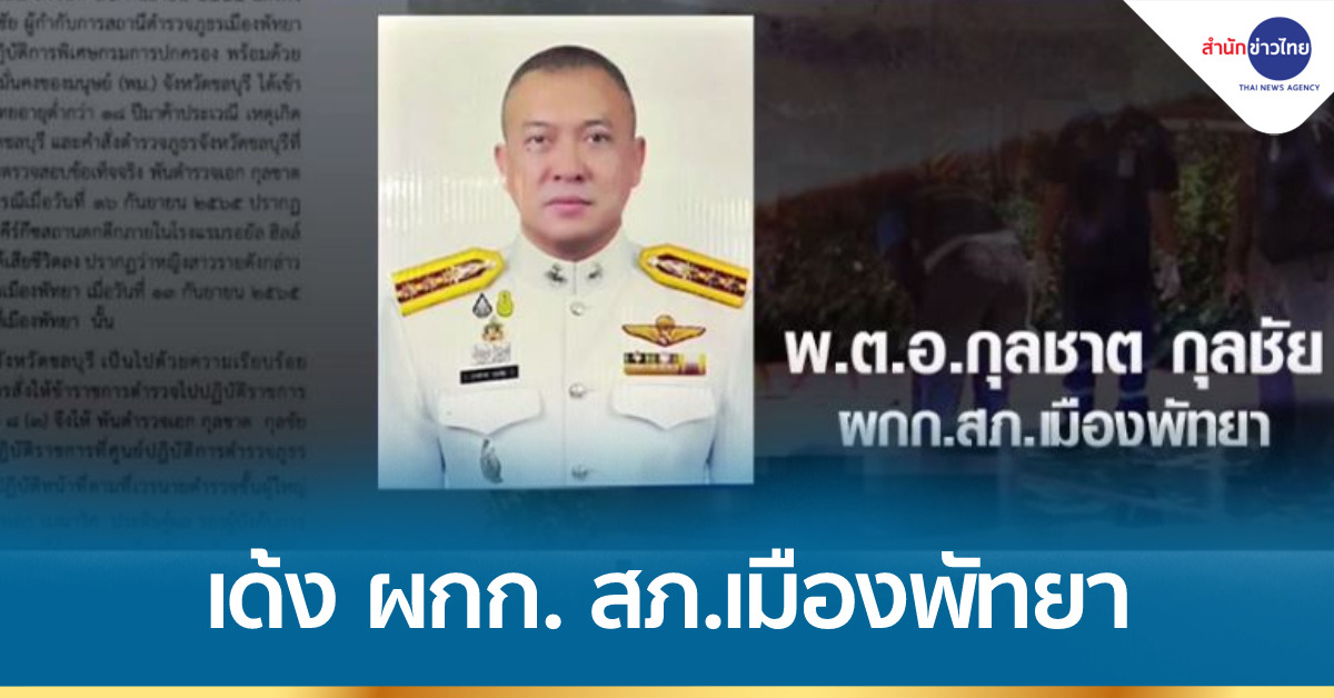 โดยผู้ที่จะมาทำหน้าที่ ผู้กำกับสถานีตำรวจภูธรเมืองพัทยา แทน พันตำรวจเอก กุลชาต กุลชัย คือ พันตำรวจเอก เมฆาวิศ ประดิษฐ์ผล รองผู้บังคับการ ตำรวจภูธรจังหวัดชลบุรี รักษาราชการแทนในตำแหน่ง ผู้กำกับการสภานีตำรวจฎธรเมืองพัทยา อีกหน้าที่หนึ่ง โดยไม่ขาดจากตำแหน่งและหน้าที่ทางสังกัดเดิม คำสั่ง สั่ง ณ วันที่ 18 กันยายน พ.ศ. 2565 ลงชื่อ พลตำรวจตรี อรรถสิทธิ์ กิจจาหาญ ผู้บังคับการตำรวจภูธรจังหวัดชลบุรี.-สำนักข่าวไทย