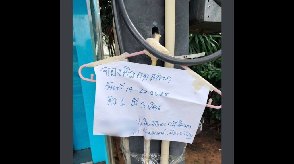 กลายเป็นกระแสวิพากษ์วิจารณ์กันอย่างกว้างขวางในโลกออนไลน์ หลังผู้ใช้เฟซบุ๊ก “กลุ่มคนขายหวยรายย่อย สลากดิจิทัล-เสรี 2565” โพสต์ระบุว่า “วันนี้ว่าจะกดตังค์จะได้ไหม กลัวเสี่ยจัง” พร้อมแนบภาพการจองคิวซึ่งถูกเขียนด้วยลายมือใส่กระดาษ A4 ติดกับไม้แขวนเสื้อ ห้อยที่เสาไฟฟ้าหน้าตู้เอทีเอ็ม ใบจองระบุว่า “จองคิวกดสลากวันที่ 19-20 ก.ย.65 คิว 1 มี 3 บัตร ใครดึงออกมีปัญหากับผมแน่…มีวงจรปิด เหตุเมื่อวันที่ 17 ก.ย. ที่ผ่านมาที่ จ.ยโสธร