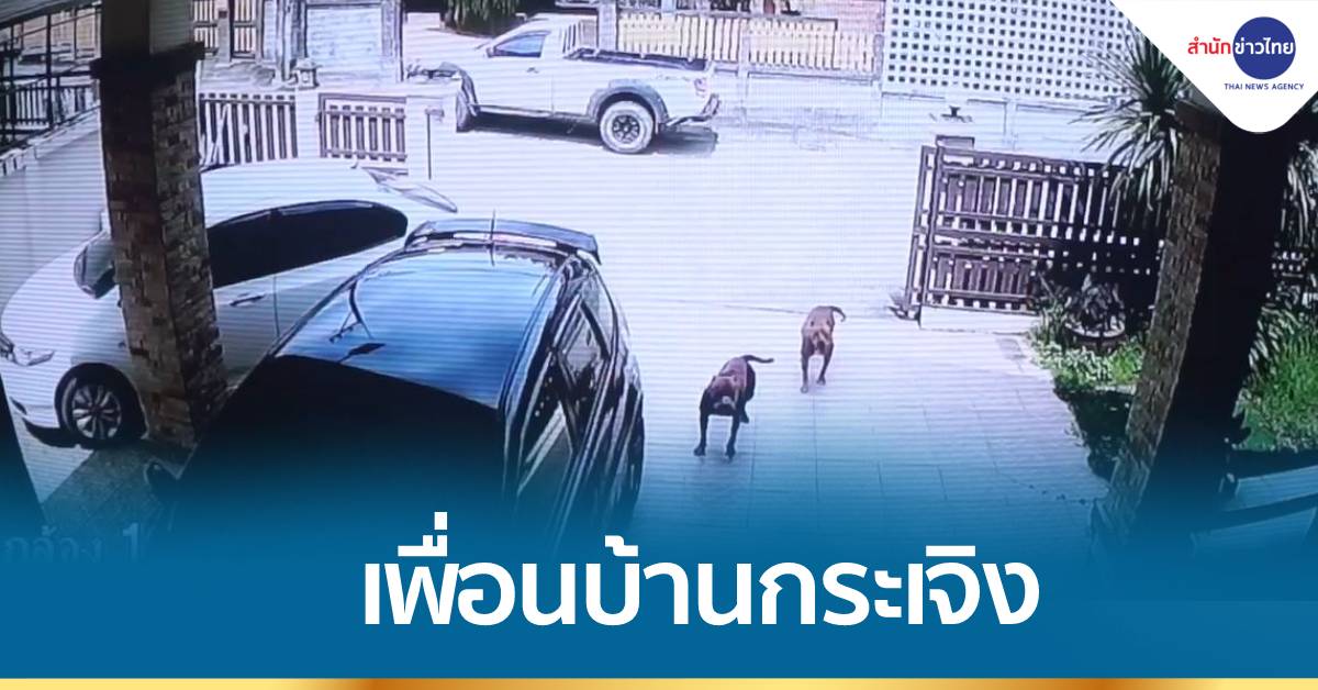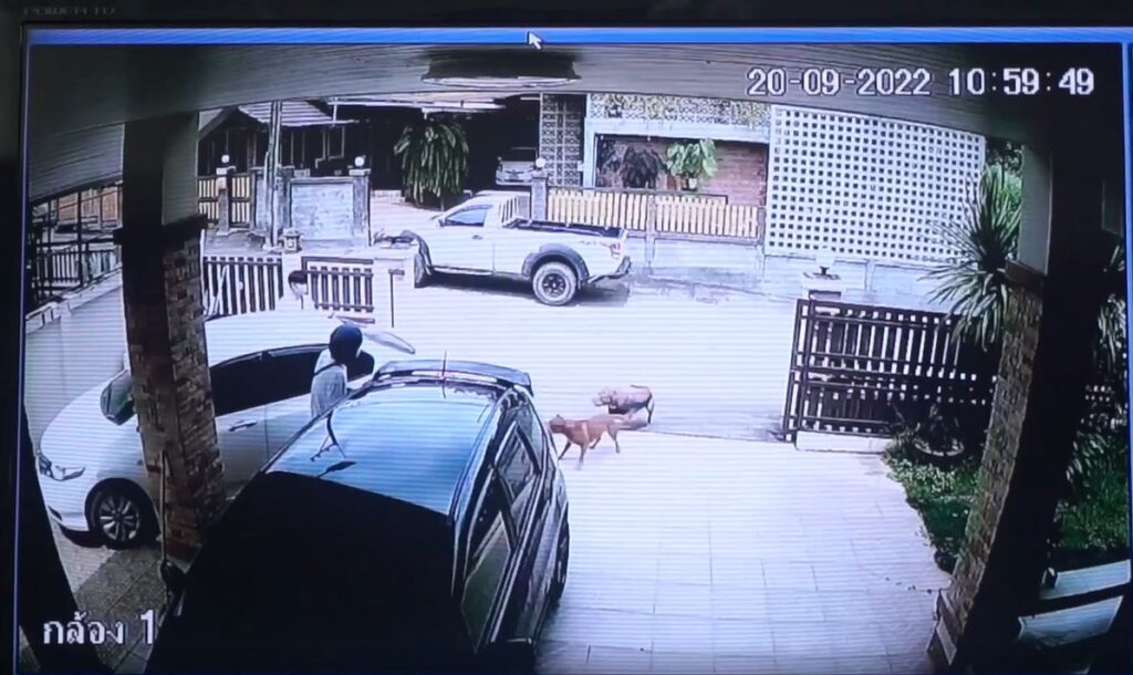 วงจรปิดจับภาพชาย 2 คน เปิดประตูรั้วเตรียมเอารถออกไปข้างนอก ทันใดนั้นสุนัขพันธุ์อเมริกันพิตบลู 3 ตัว หลุดจากบ้านถัดไปประมาณ 3 หลัง ในหมู่บ้านแห่งหนึ่งใน ต.เมือง อ.เมือง จ.เลย วิ่งเข้ามาเหมือนจะกระโจนใส่ เจ้าของบ้านกระเจิงคนละทิศละทาง หยิบฉวยด้ามไม้ขู่ตีไล่